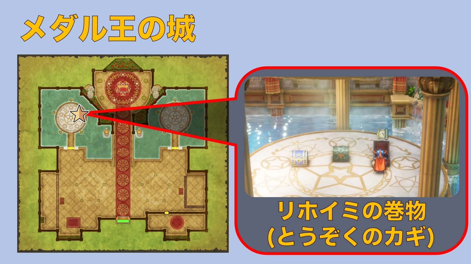 リホイミの巻物は、メダル王の城で入手できます。リホイミは、数ターンの回復効果の他に超絶技の発動条件にもなっている呪文です。効果発動中は、補助系の特技と呪文を超絶技として発動できます。