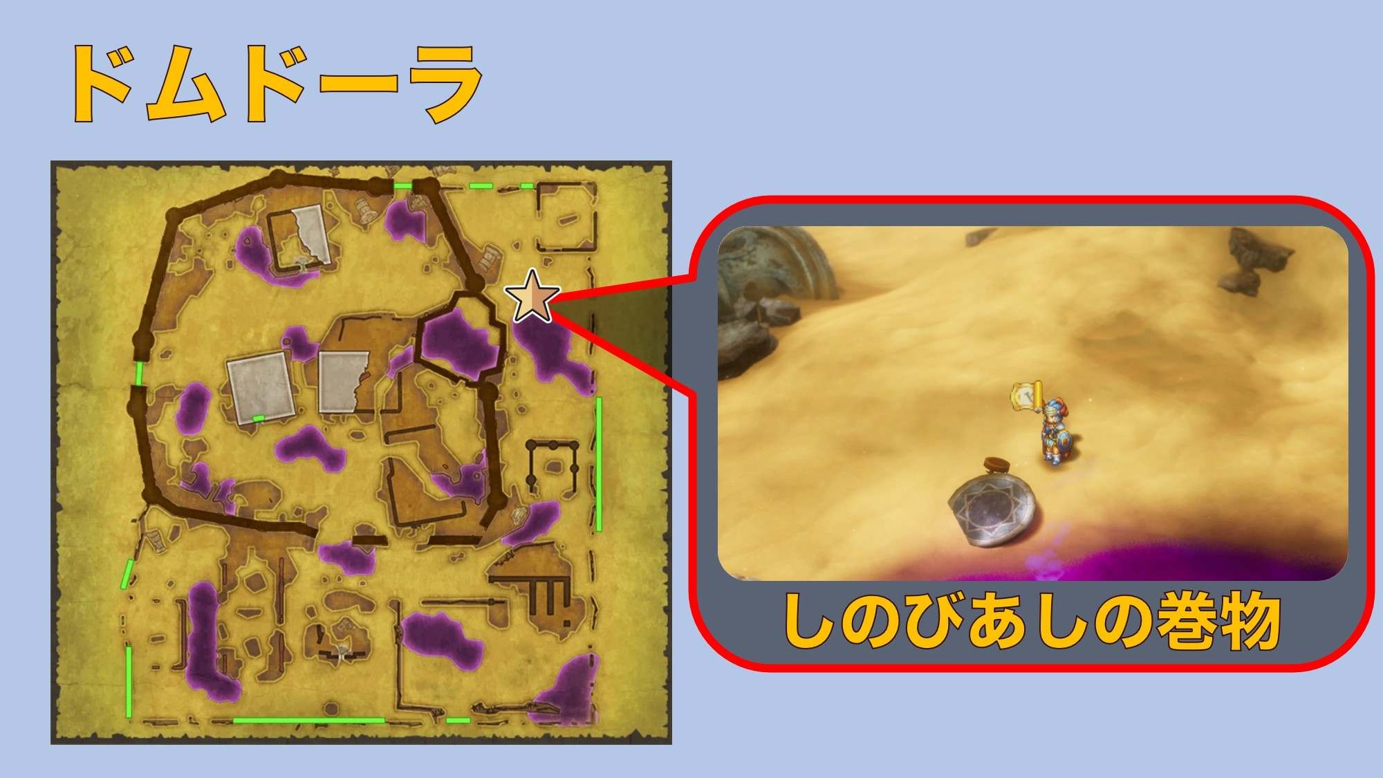 しのびあしの巻物は、ドムドーラで入手できます。しのびあしは、敵とのエンカウント率を下げてくれるので、マップ探索を快適に進めたい時に便利な特技です。