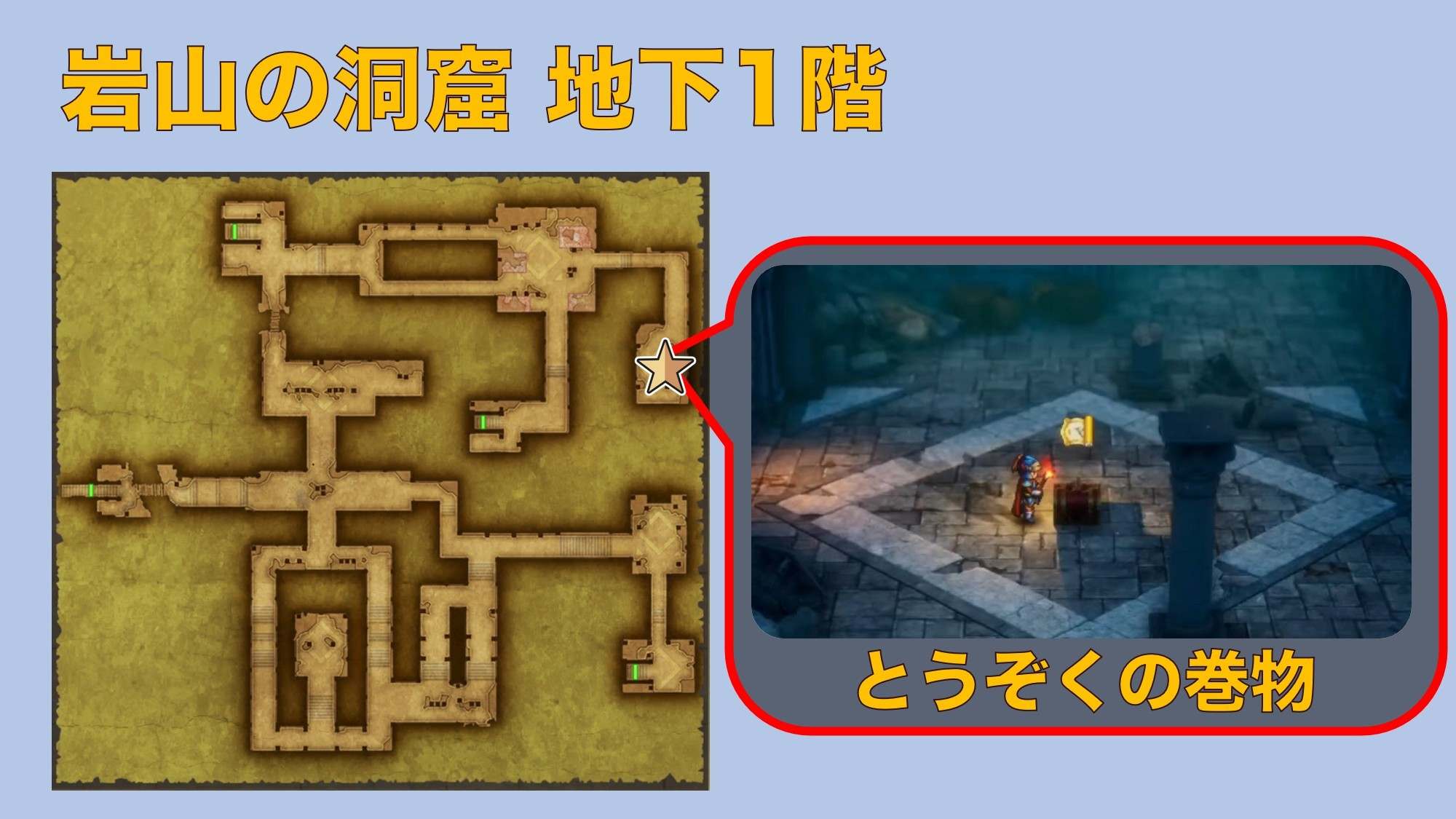 とうぞくの巻物は、岩山の洞窟の地下1階で入手できます。とうぞくのはなは、今いるマップやフィールド上にアイテムがあるかどうかを判別してくれる特技です。アイテムを取りこぼすことなく進めたい方は序盤に入手しておきましょう。