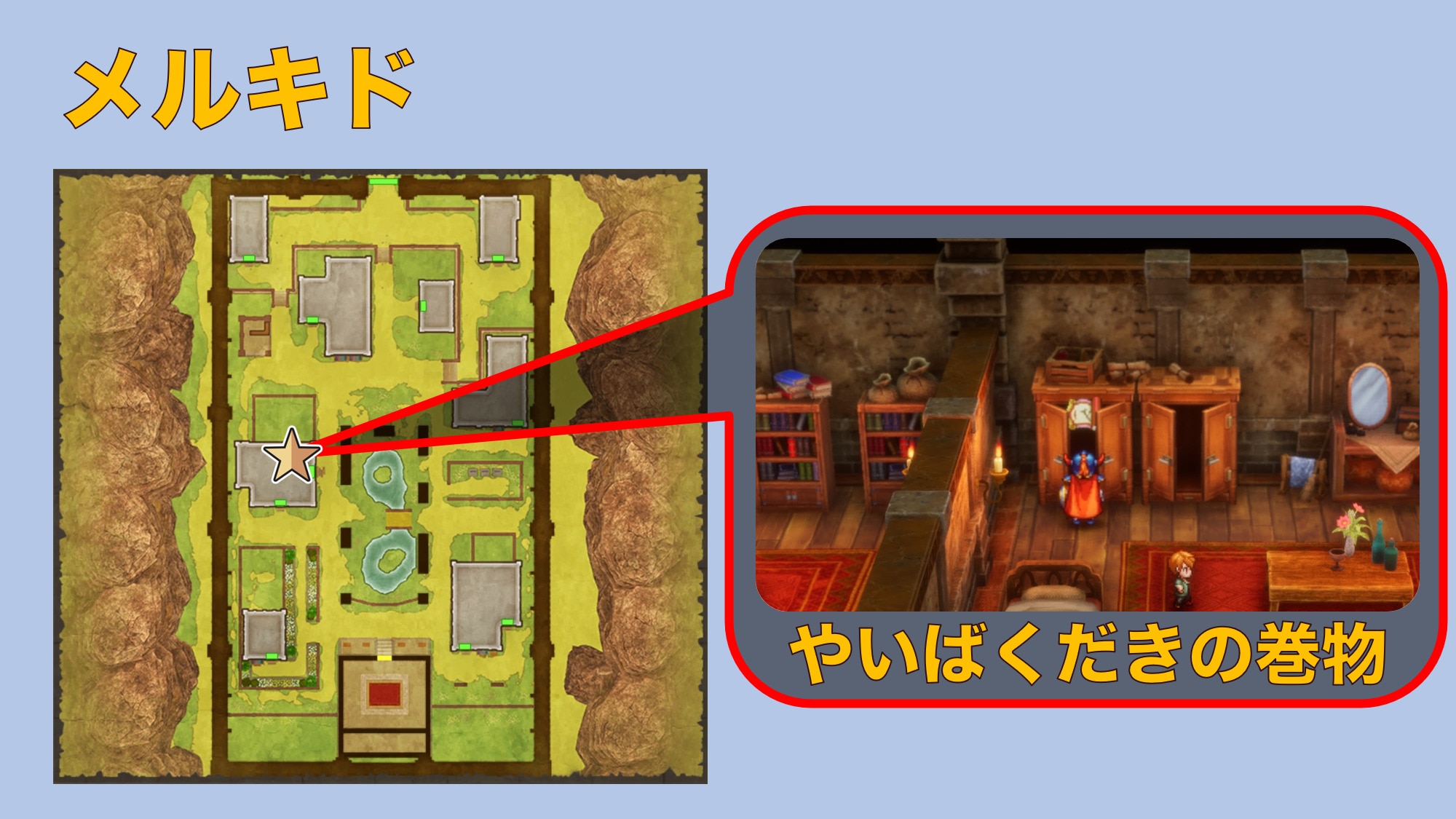 やいばくだきの巻物は、メルキドで入手できます。やいばくだきは、攻撃しつつ敵の攻撃力を確率でダウンできます。物理攻撃主体のボス戦で被ダメージを抑えやすくなるのでおすすめです。