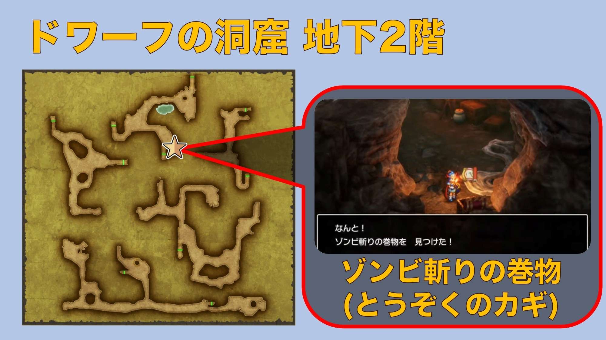 ゾンビ斬りの巻物は、ドワーフの洞窟で入手できます。ゾンビ系の敵に対して高いダメージを出せるゾンビ斬りは、中盤以降のボス戦で重宝します。超絶技でグランドクロスにすればさらに高いダメージを与えることもできます。