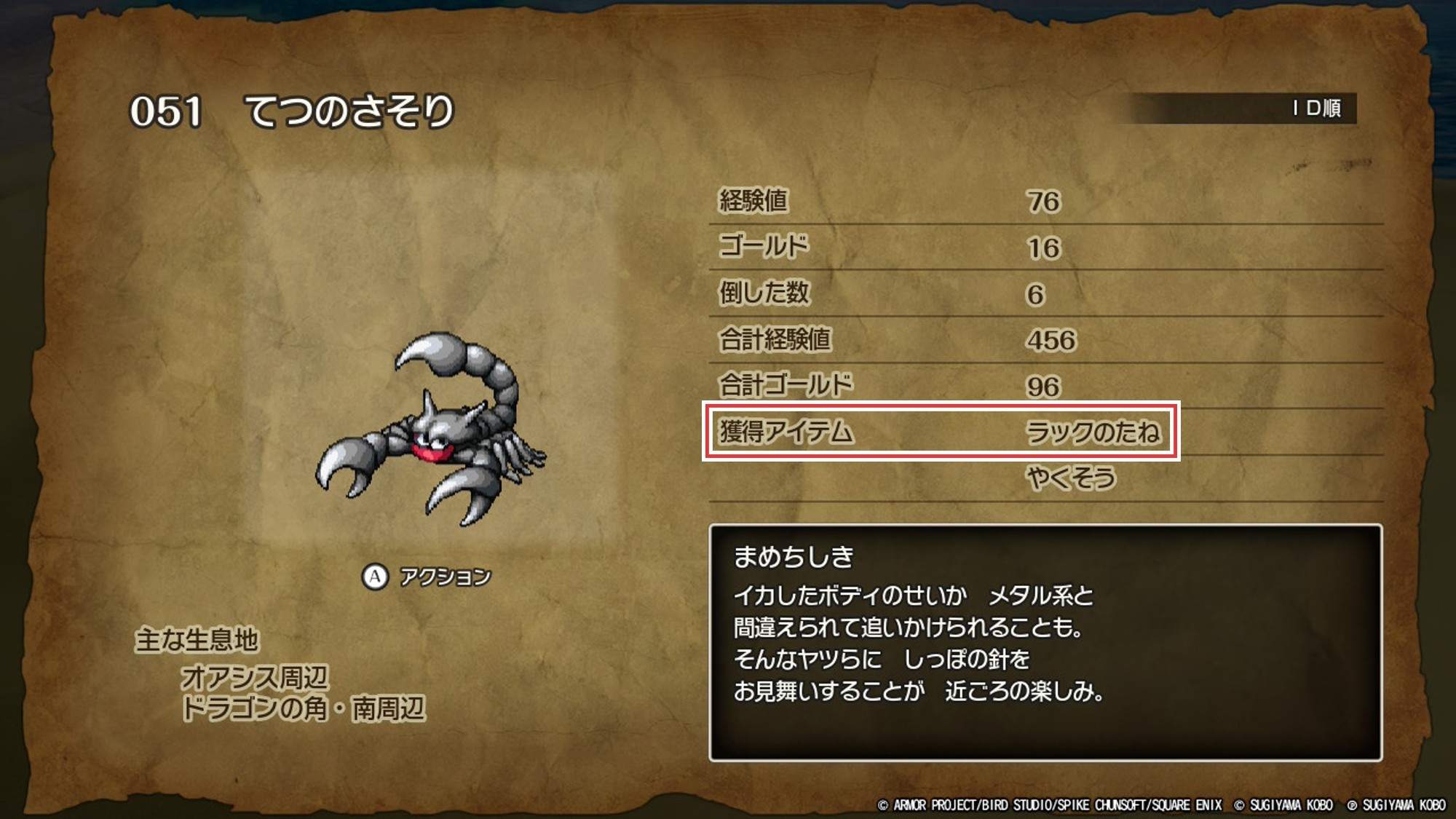 モンスターのドロップアイテムは、せんれきから確認できます。獲得アイテムが2種類表記されてますが、上段があなほりで入手できるアイテムで、下段が別の呪文であるぬすっと刈りで入手できるアイテムです。