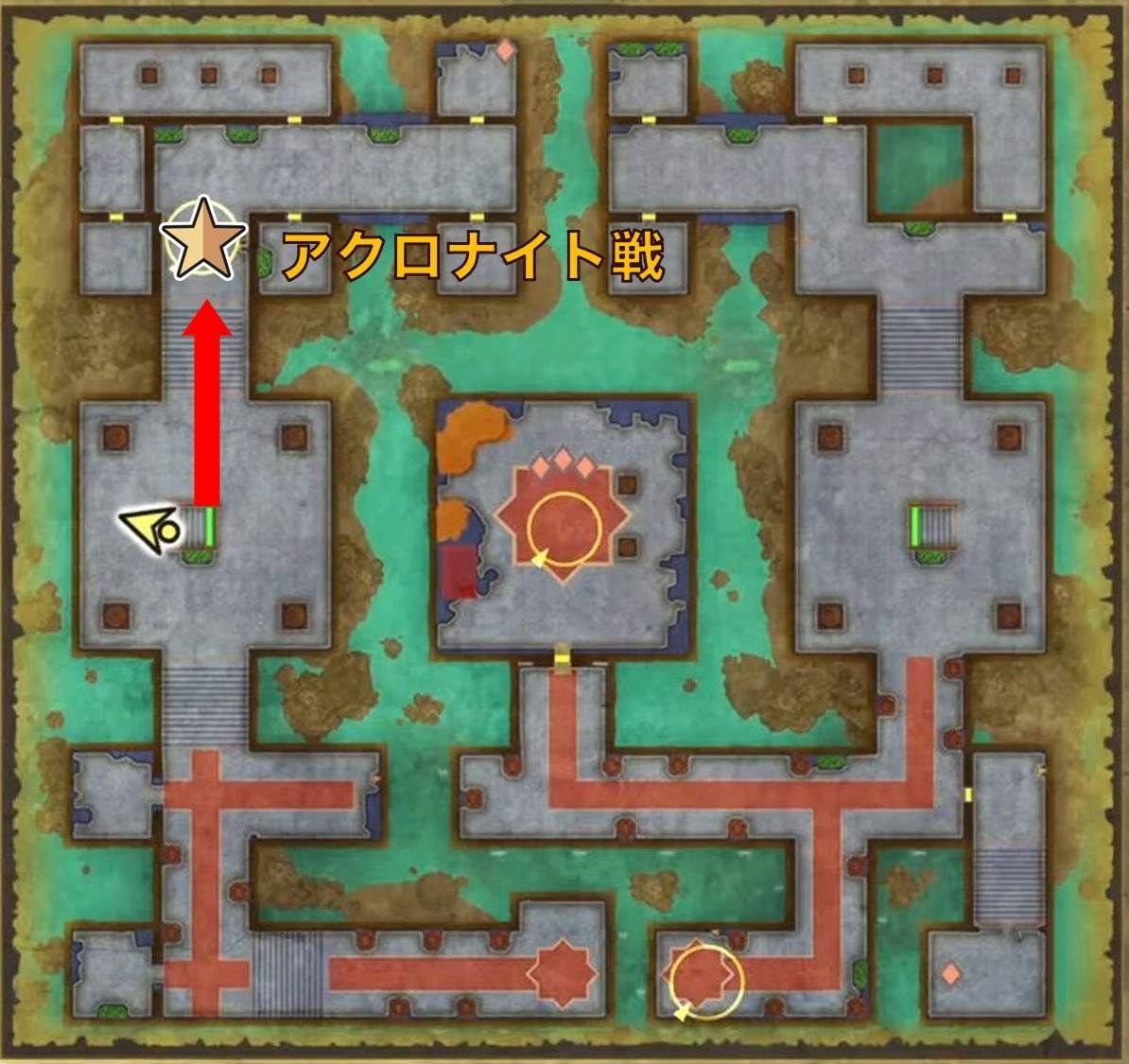 拡大するイベントが終わったら、1階西にある階段を下ります。下りたらすぐ北に向かい、アクロナイトを倒しましょう。