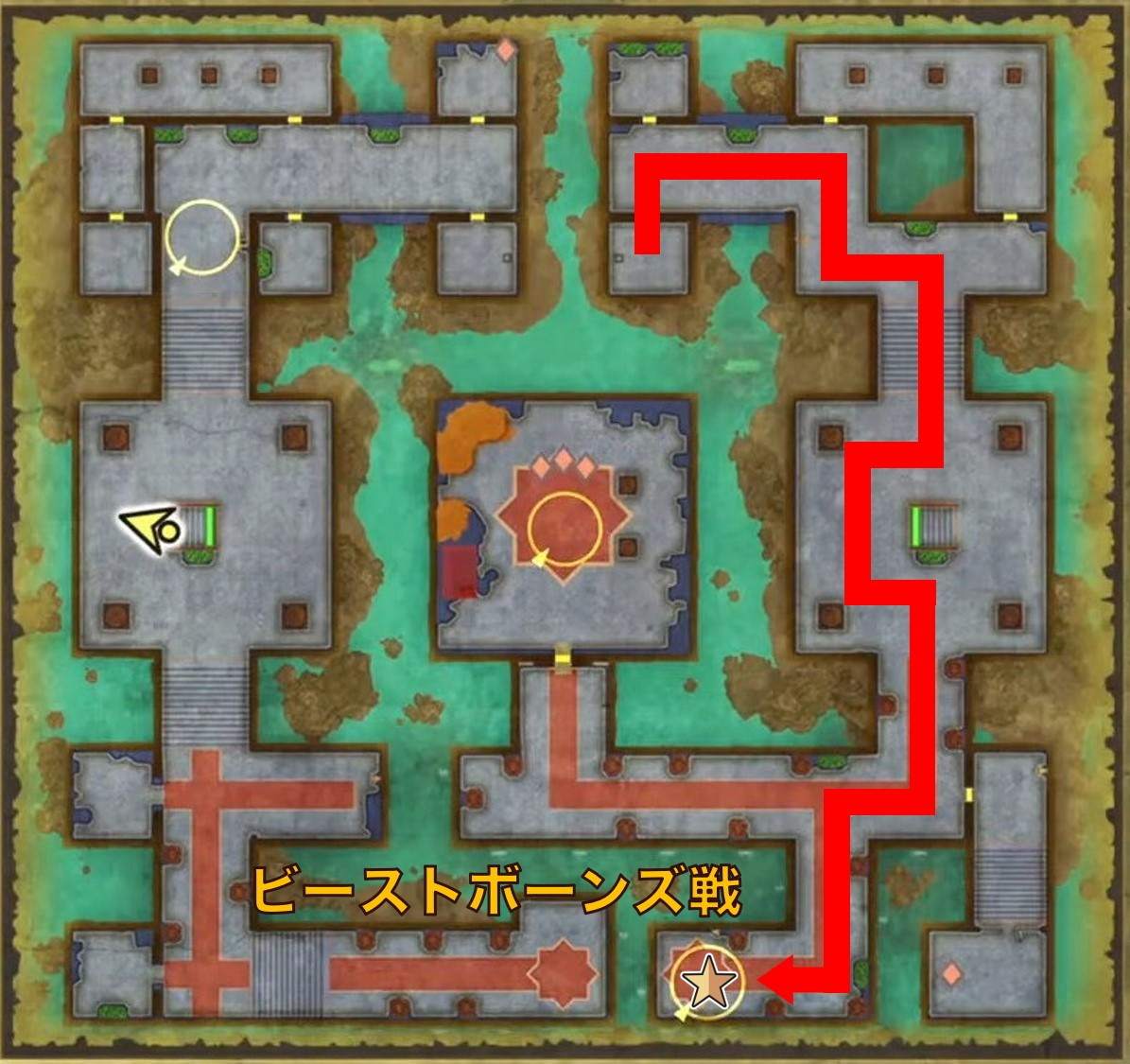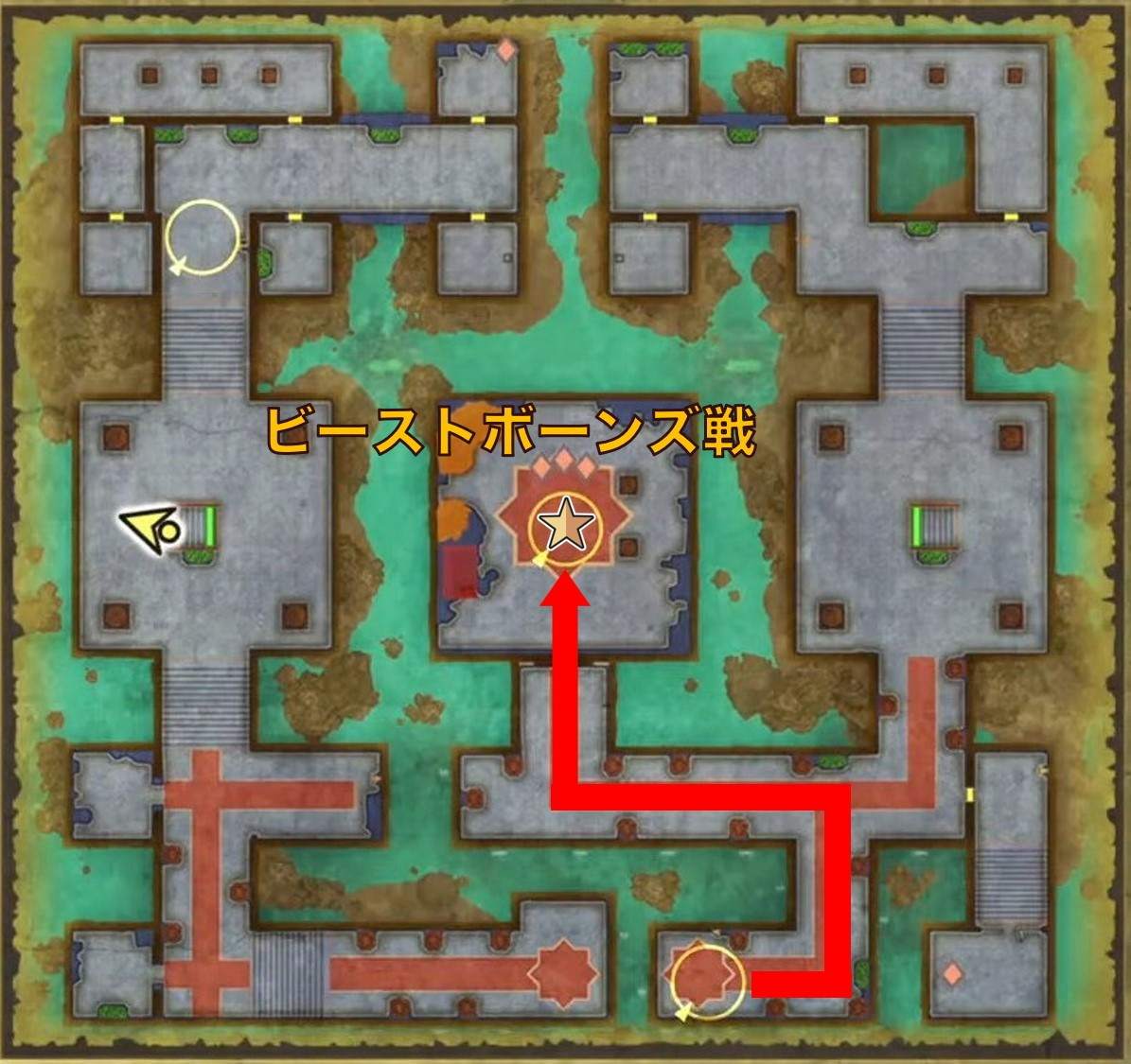 中央の広間に着くと、2回目のビーストボーンズ戦が始まります。強さは1回目と変わらないので、同じ立ち回りで倒しましょう。