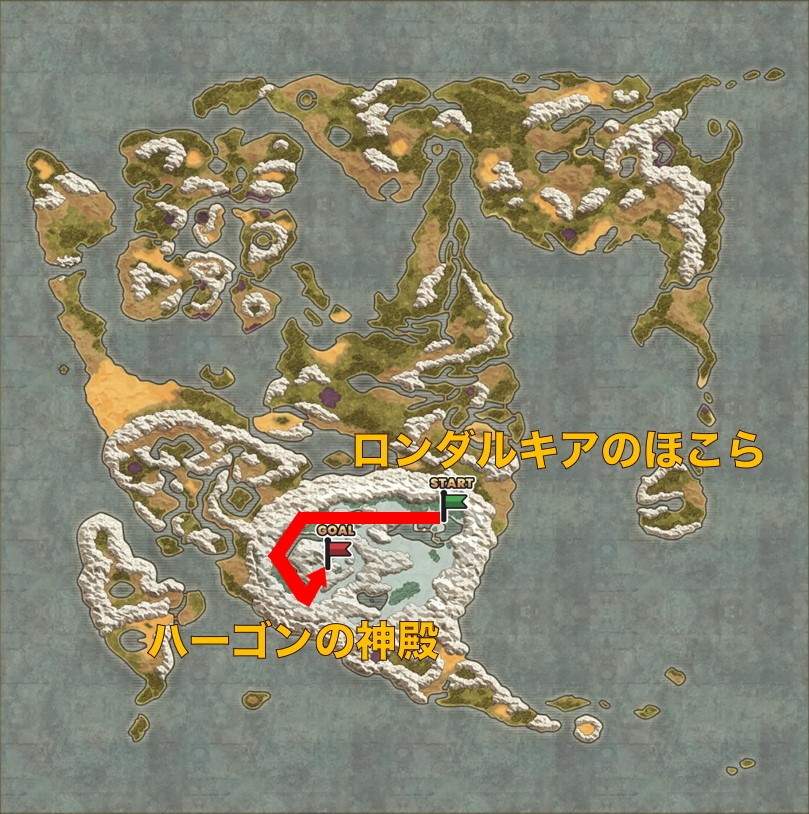 ロンダルキアのほこらから、南西にあるハーゴンの神殿に向かいましょう。直線では行けず、北側の道から反時計周りに回り込む必要があります。