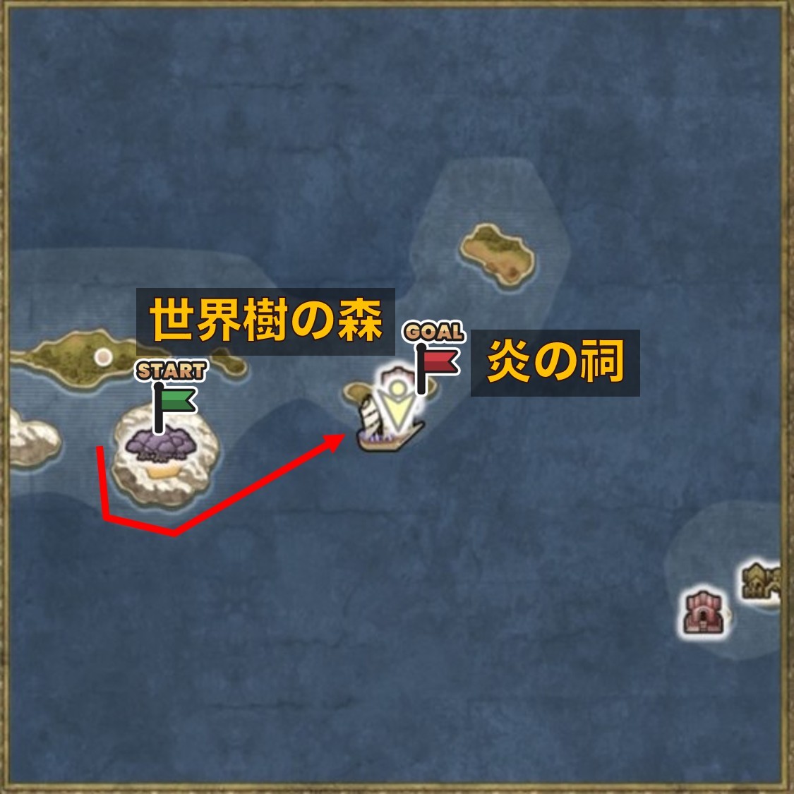 炎の祠は、世界樹の森から船で東に進んだ場所にあります。