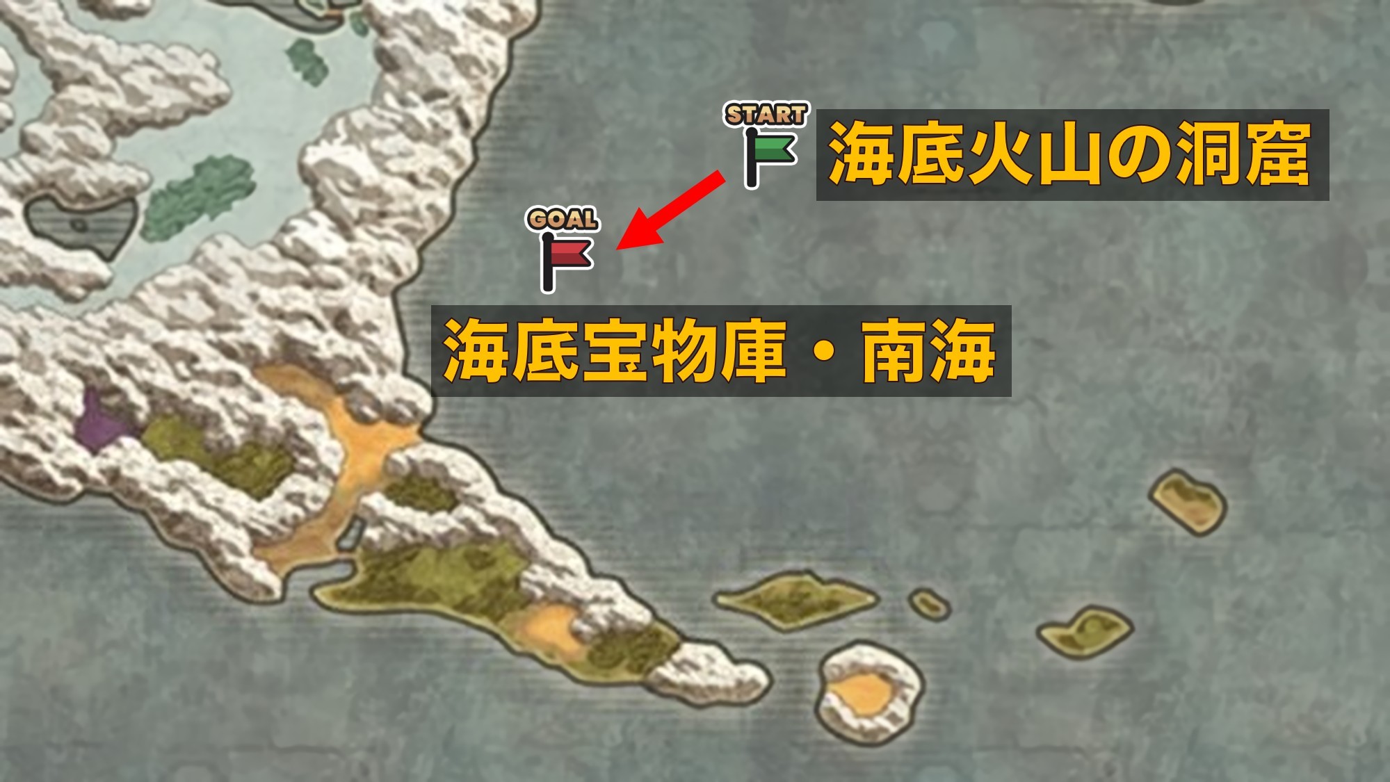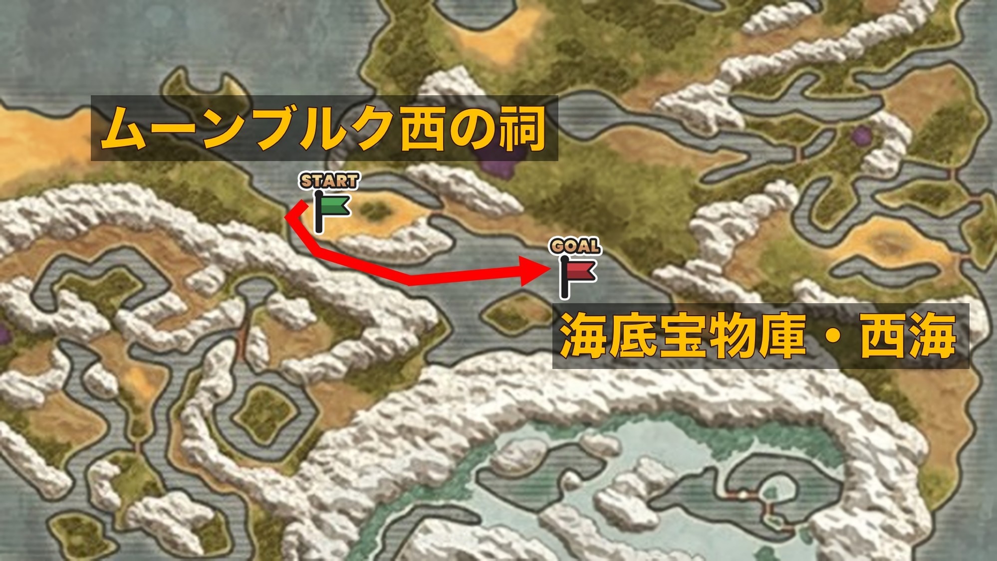 海底宝物庫・西海は、ムーンブルク西の祠から東の場所にあります。満月の塔を攻略した後に行けるため、先にストーリーを進めましょう。