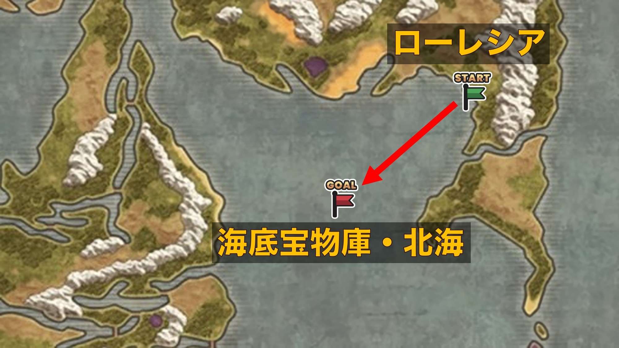 海底宝物庫・北海は、ローレシアから南西の場所にあります。深海へ行くために、ストーリーで沈没船後に人魚の女王に話しかけるところまで進めましょう。