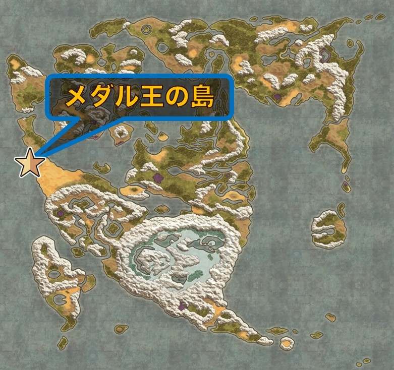 ちいさなメダルの交換場所は、ワールドマップにあるメダル王の城です。メダル王に話しかけると、持っているメダルの枚数に応じて装備品や巻物などの報酬がもらえます。