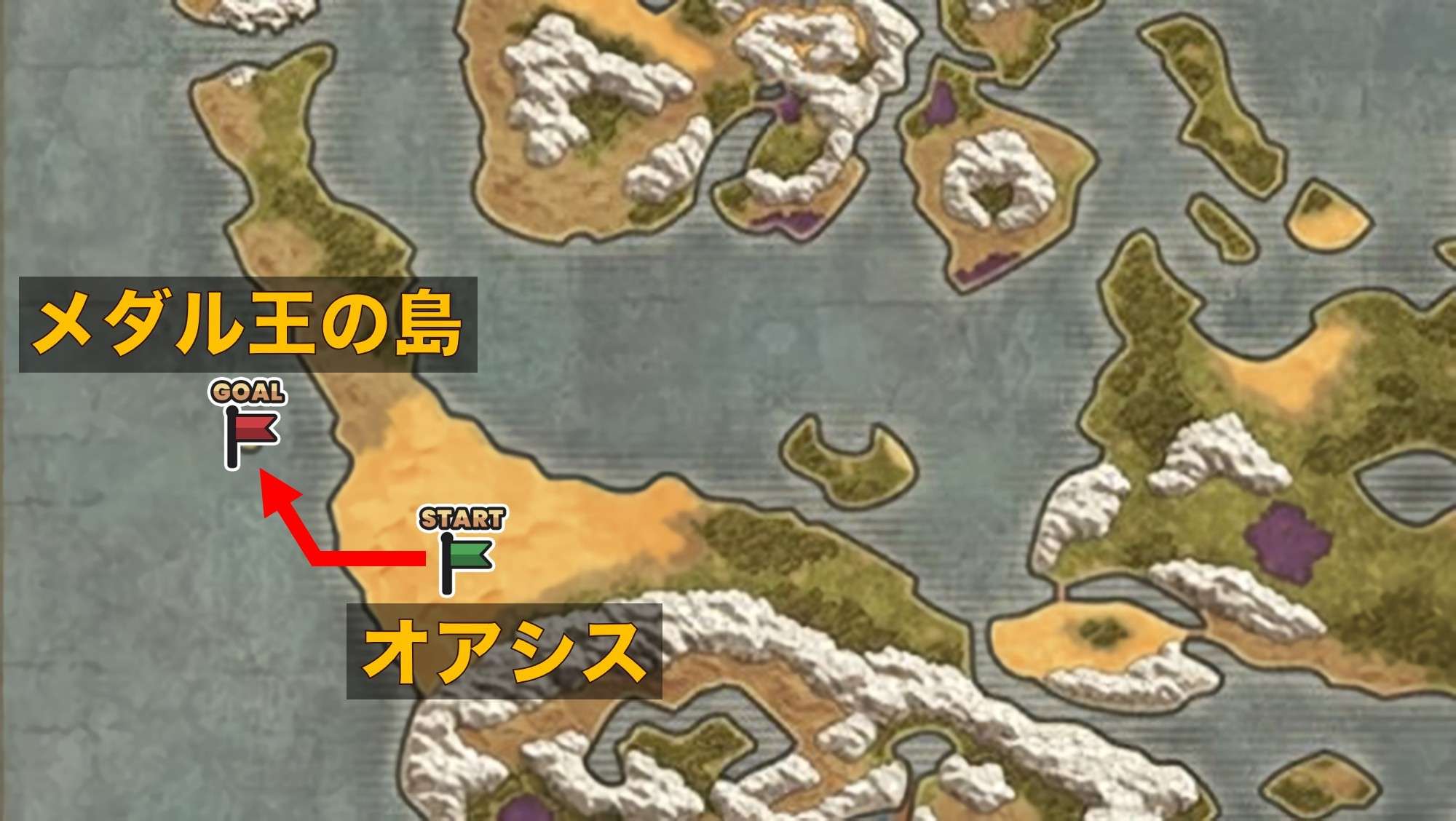 メダル王の島は、オアシスから北西の位置にあります。船で向かう必要があるため、ルプガナまでストーリーを進めましょう。
