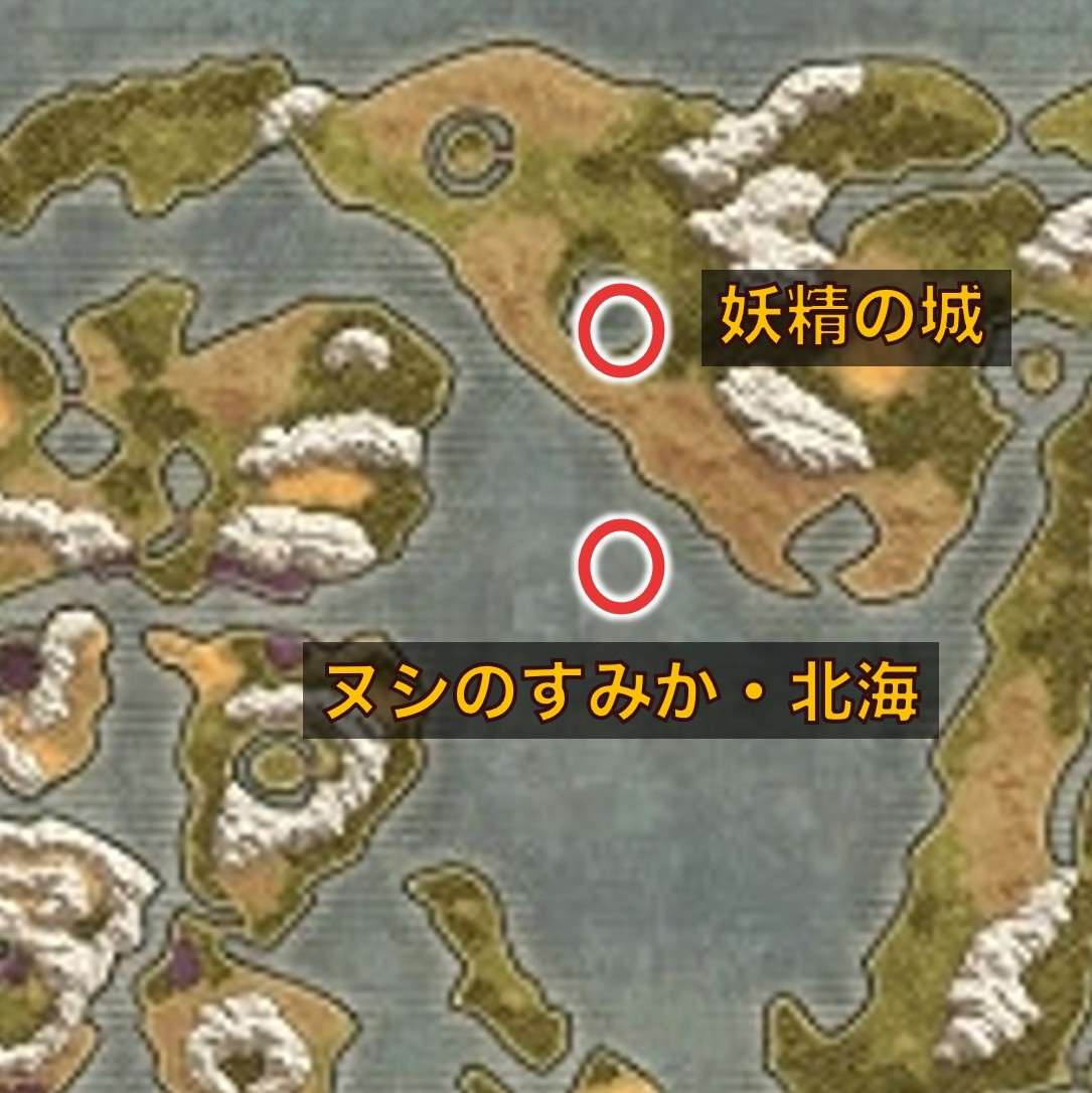 ヌシのすみか・北海の場所は、妖精の城から南に進んだ先の深海です。1度エンディングを迎えると目的地マーカーが設置され、場所が分かりやすくなります。