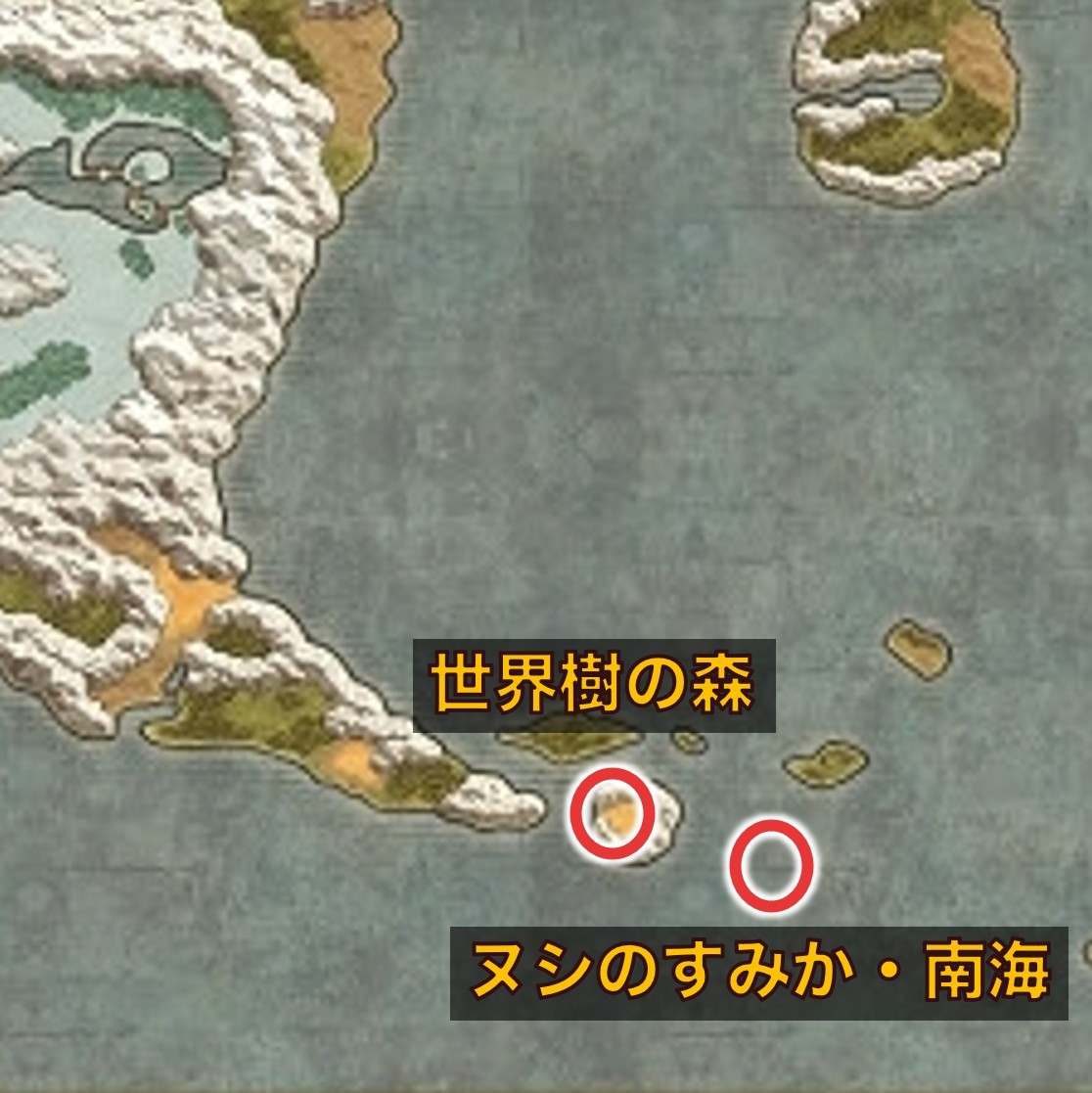 ヌシのすみか・南海の場所は、世界樹の森から東に進んだ先の深海です。1度エンディングを迎えると目的地マーカーが設置され、場所が分かりやすくなります。