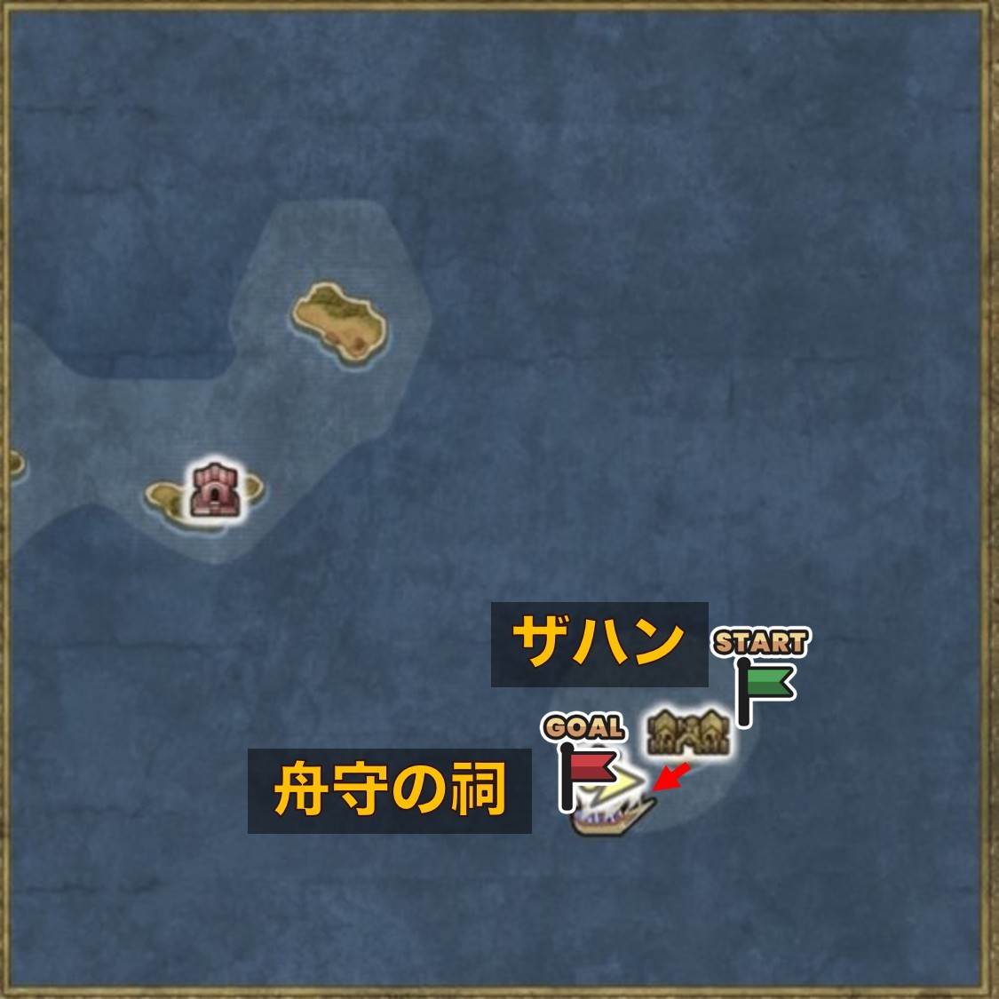 舟守の祠は、ザハンから船で南西に進んだ場所にあります。