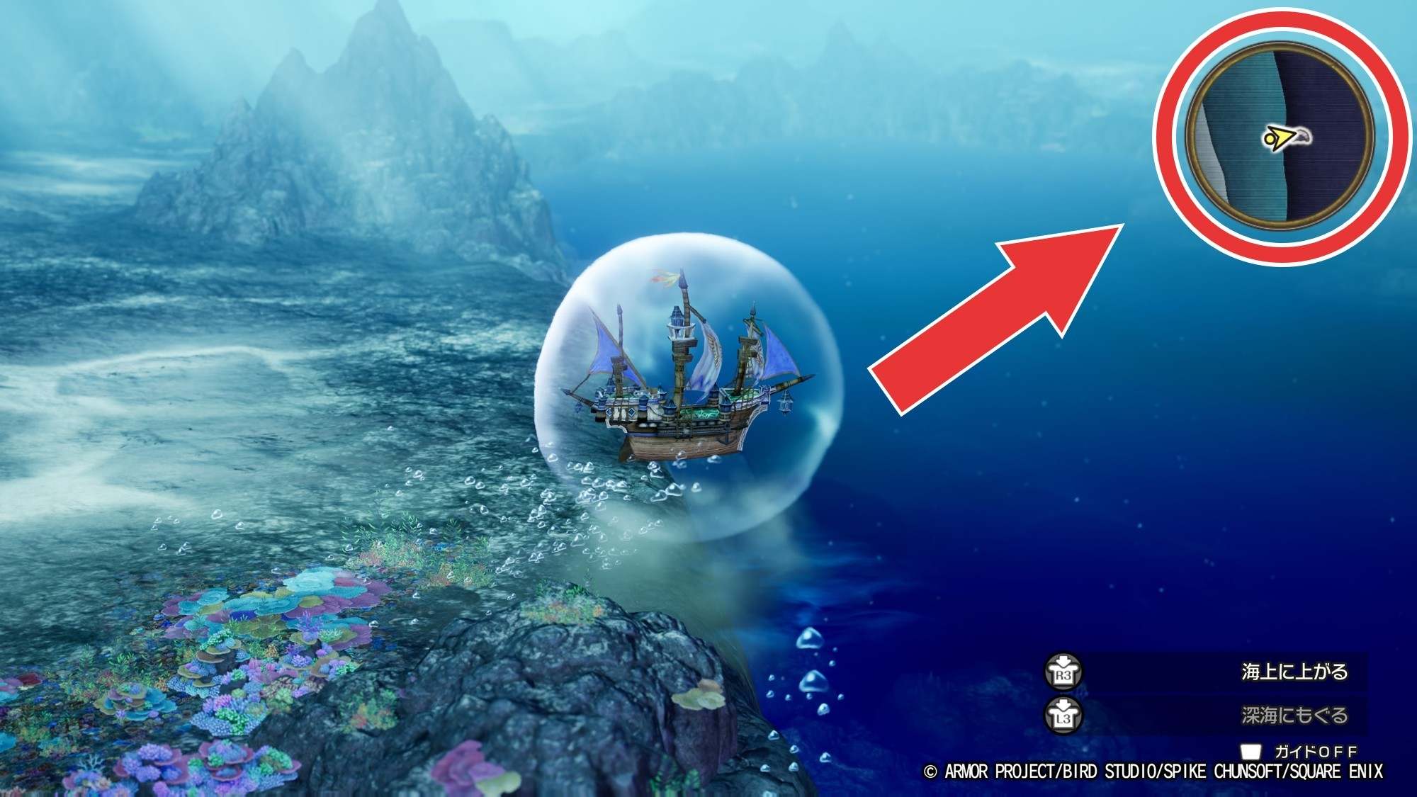ローレシアから南東付近に来たら海に潜ります。深海に潜る際は、マップの色が濃くなっている境目付近で潜ると、すみかを見つけやすいです。