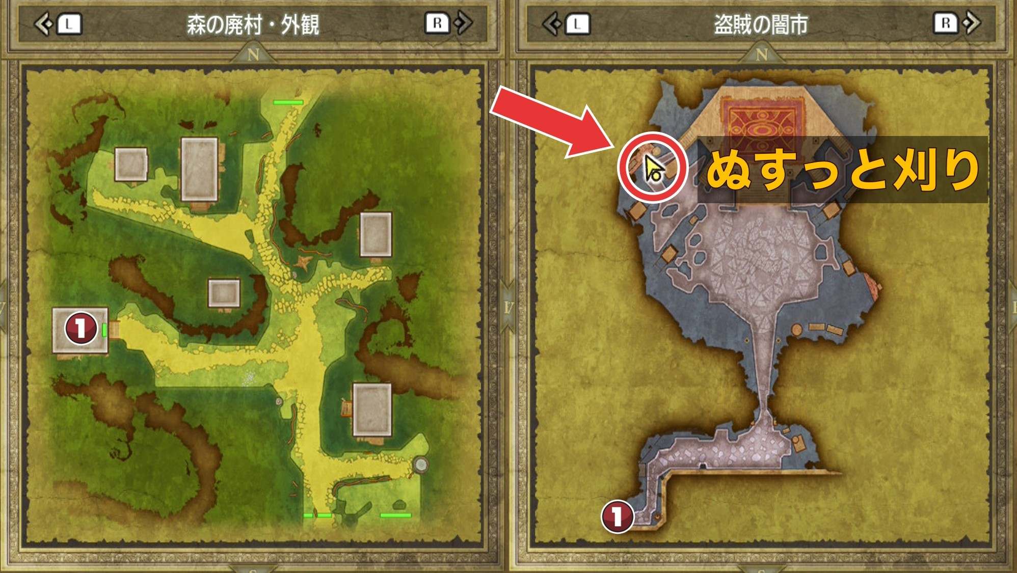 ぬすっと刈りの巻物は、森の廃村にある盗賊の闇市で入手できます。盗賊の闇市に入る際に魔法の鍵が必要なため、先に人魚の聖域までストーリーを進めましょう。