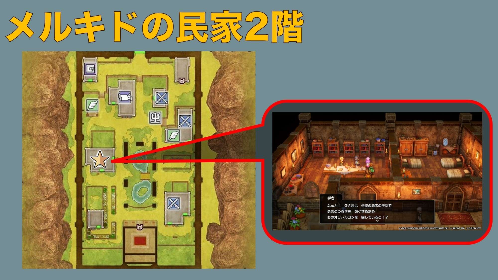 マイラで鍛冶屋のイベントを見たら、メルキドの民家2階へ向かいましょう。2階にいる学者に話しかけるとイベントが進行します。