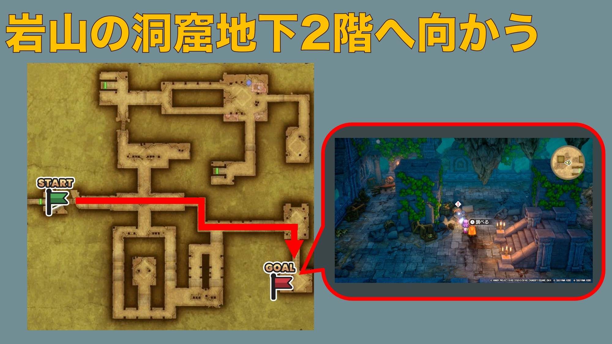 岩山の洞窟に着いたら、南東の階段から地下2階へ進みましょう。地下2階のキラキラを調べるとオリハルコンを入手できます。