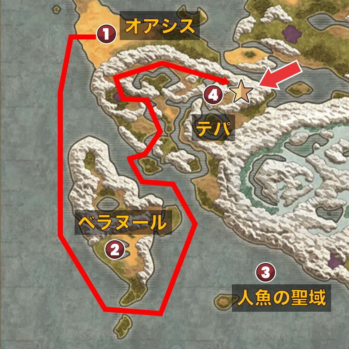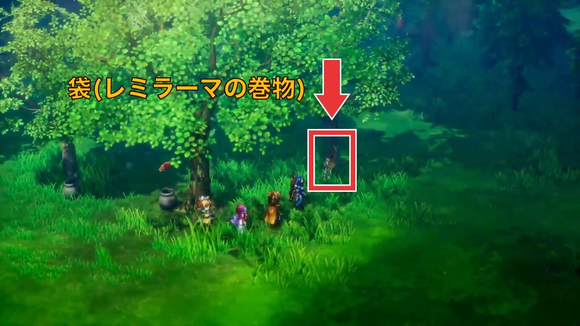 レミラーマの巻物は、テパ東にある秘密の場所内の袋に入っています。オアシスやベラヌール、人魚の聖域から向かえるので、現在の進行度に応じて出発地点を変えましょう。