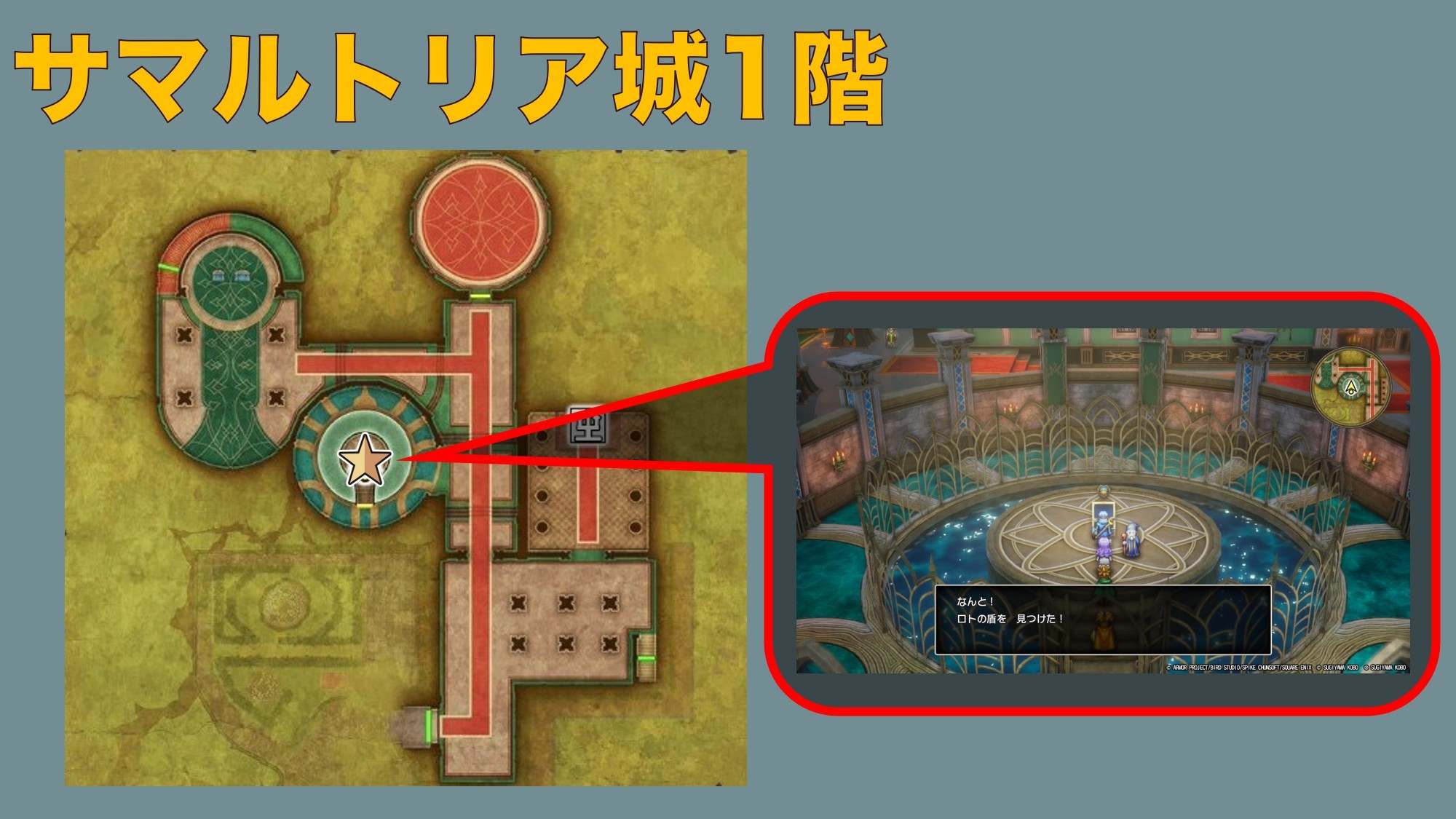 ロトの盾は、サマルトリア城1階の宝箱から入手できます。宝箱を開けるには魔法の鍵が必要なため、ストーリー中盤の人魚の聖域まで進めて魔法の鍵を入手しましょう。