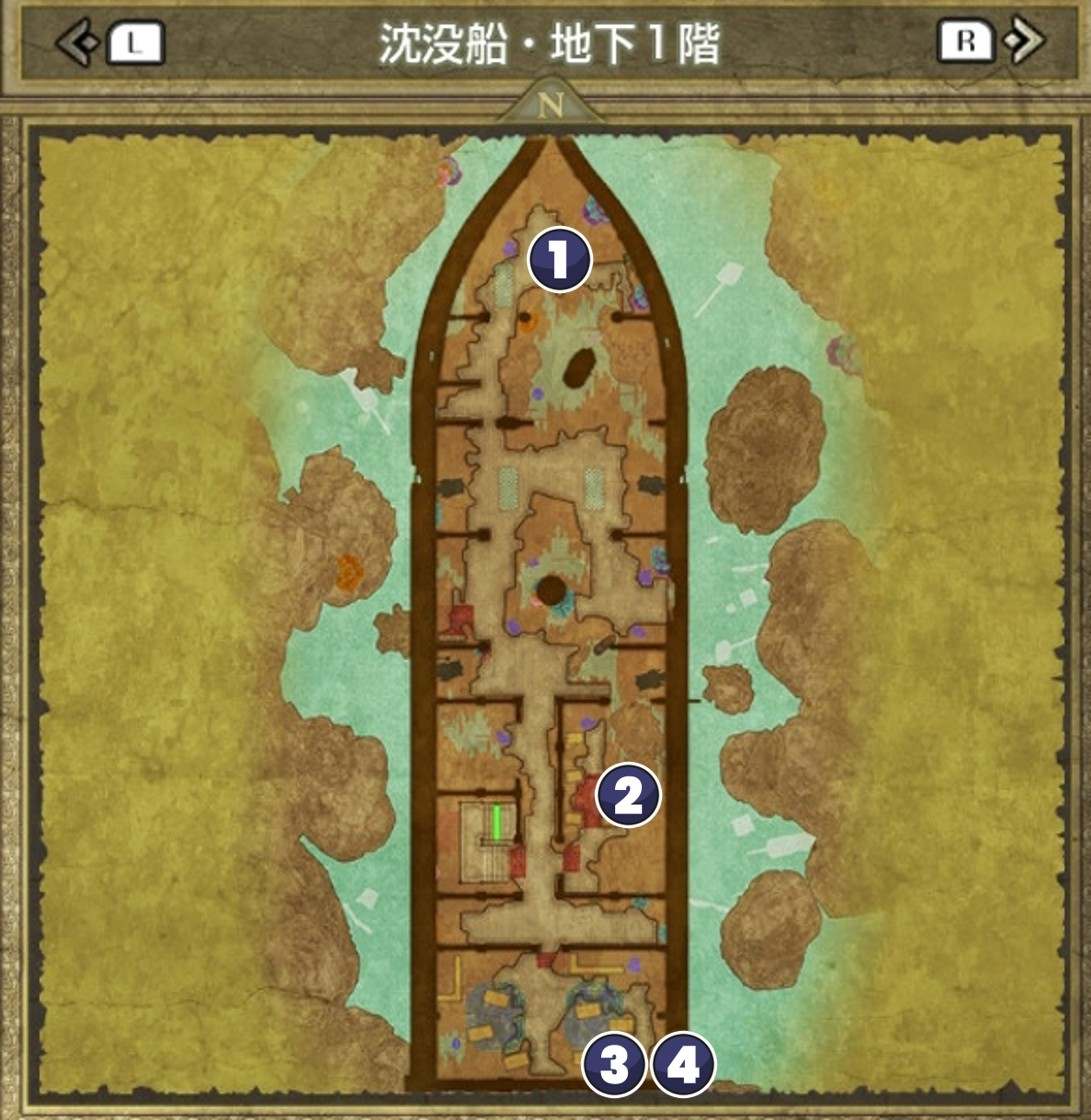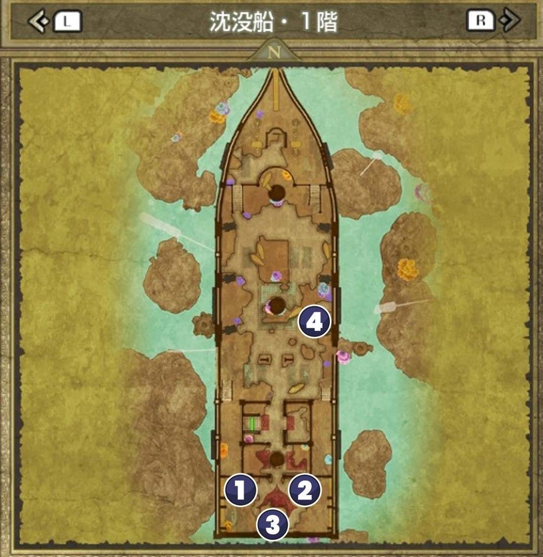 沈没船は地下一階からスタートします。まずは南西にある階段を登って1階を目指しましょう。