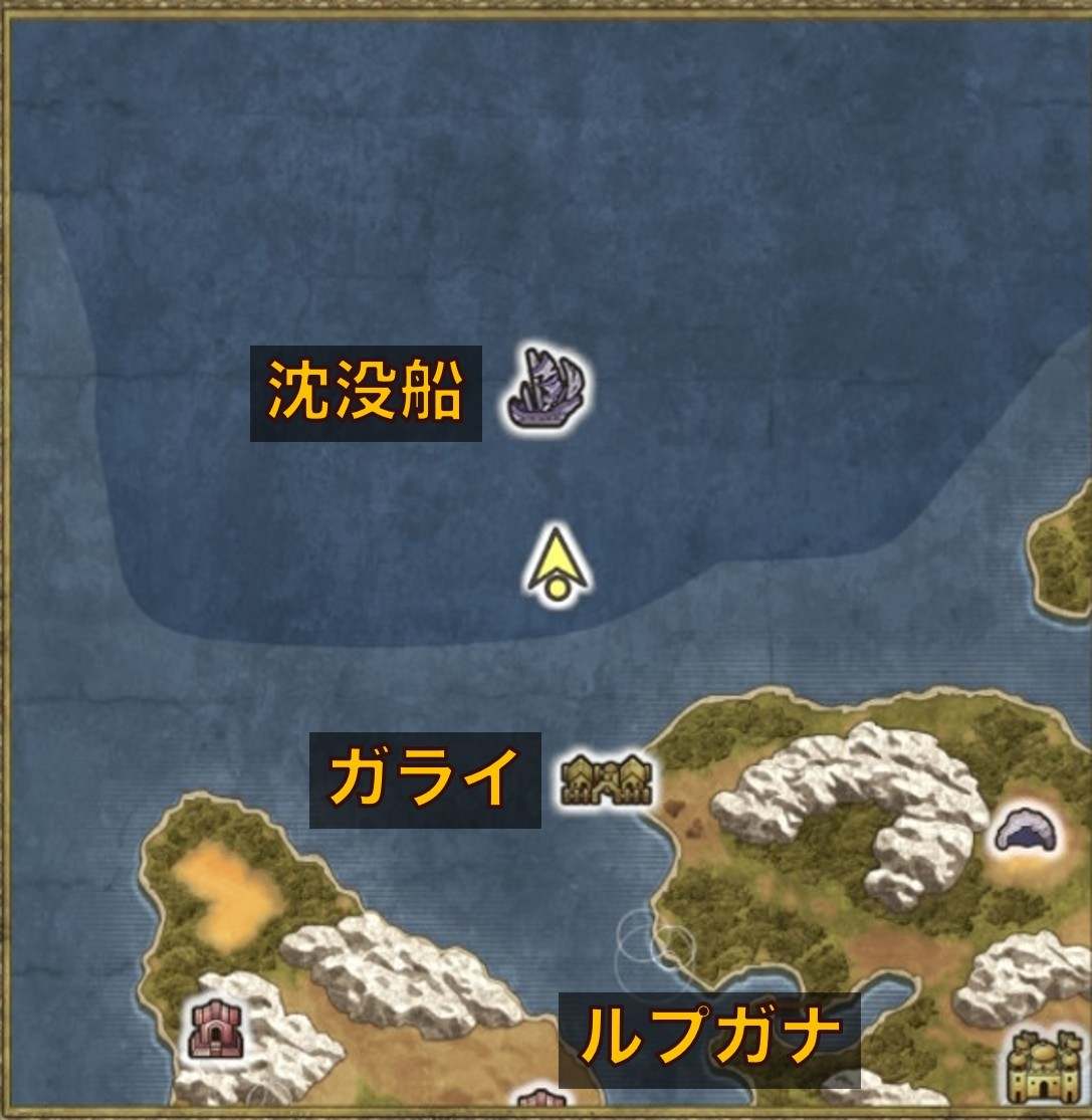 沈没船は、ガライから北に進んだ先の海底にあります。ガライにルーラで移動してから、マーメイドハープで海底に潜って探しましょう。