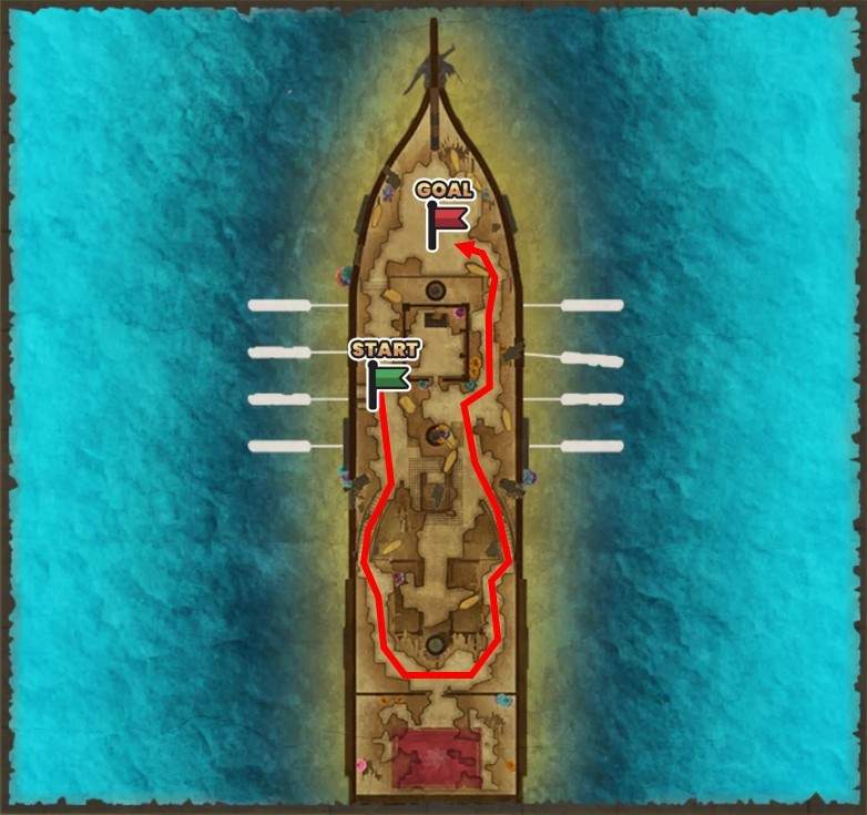 幽霊船の中に入ったら、甲板を反時計まわりに進んで船首を目指しましょう。マップ北東部分は、しかばねが道を塞いでいて直接船首には進めません。