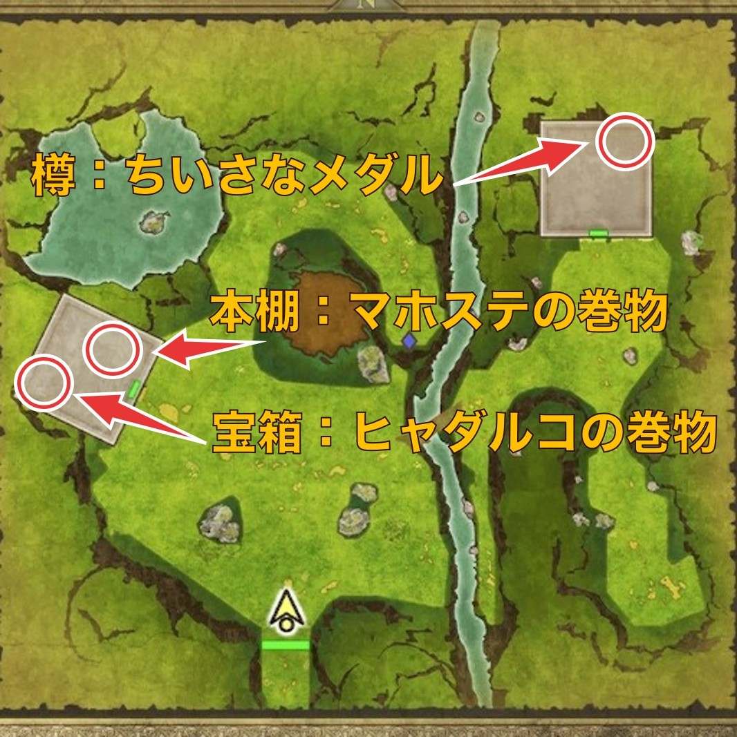 妖精の隠れ里の西にある建物には、「マホステの巻物」とカンダタ戦で有効な「ヒャダルコの巻物」を入手できるので回収しましょう。なお、北東ではちいさなメダルも回収できます。