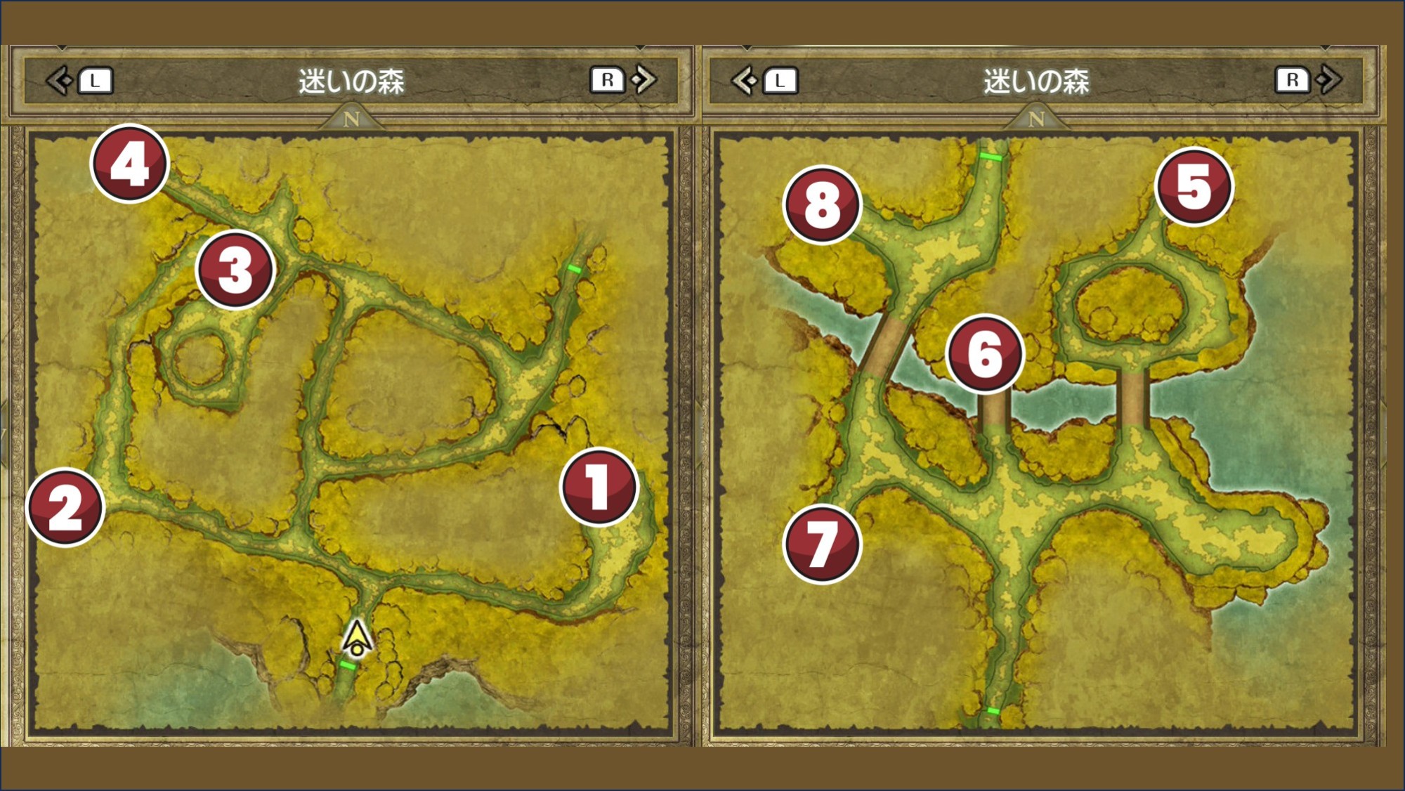 迷いの森を抜けるには、マップ移動を2回繰り返してから北東を目指しましょう。2回マップ移動を確認したのち北東の開けた場所まで進むとイベントが発生し、霧が晴れて先に進めるようになります。
