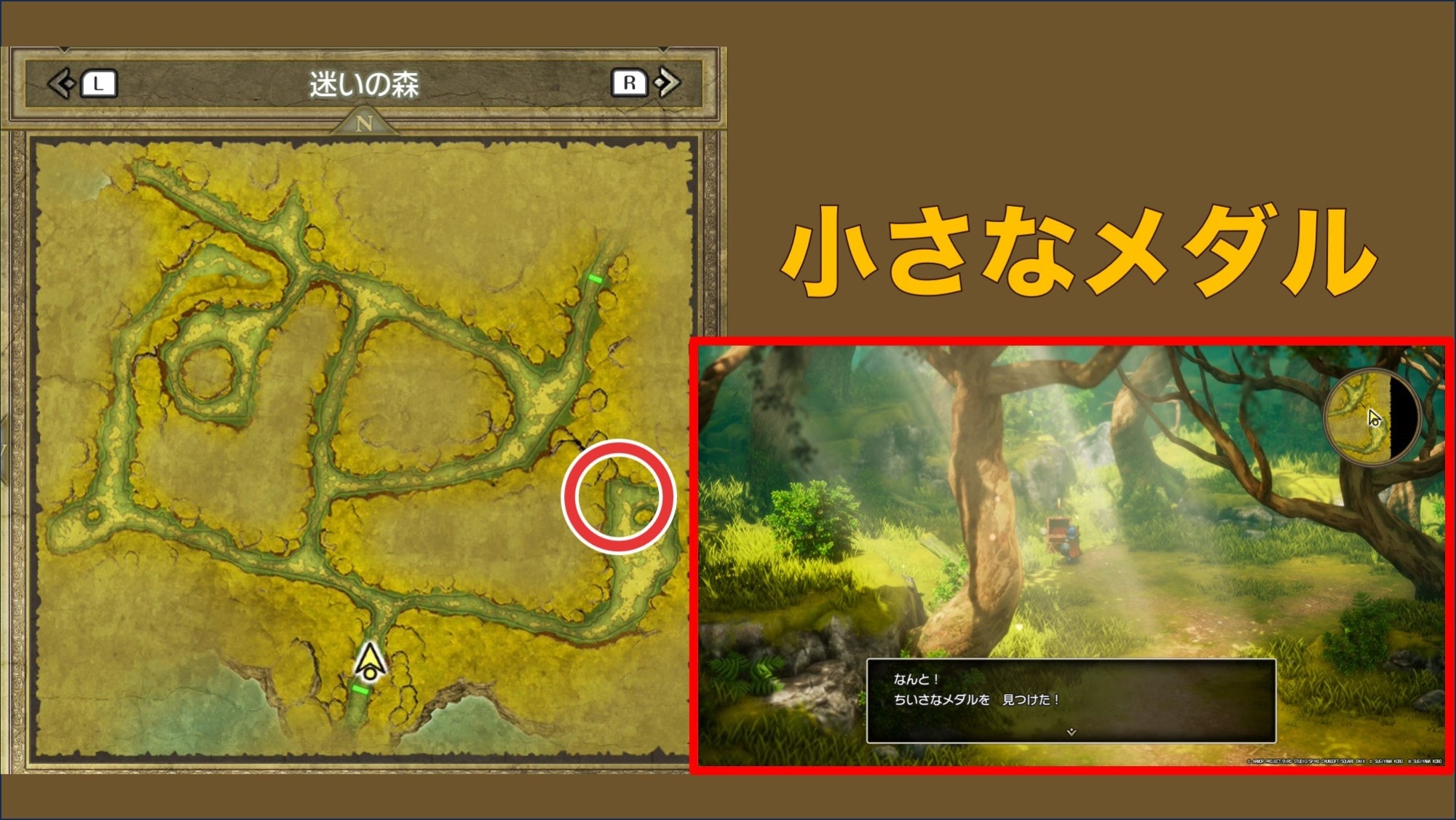 迷いの森では、宝箱から小さなメダルを1枚入手できます。入ってすぐの分かれ道を右手に曲がり、岩の手前にある宝箱を調べると回収できます。