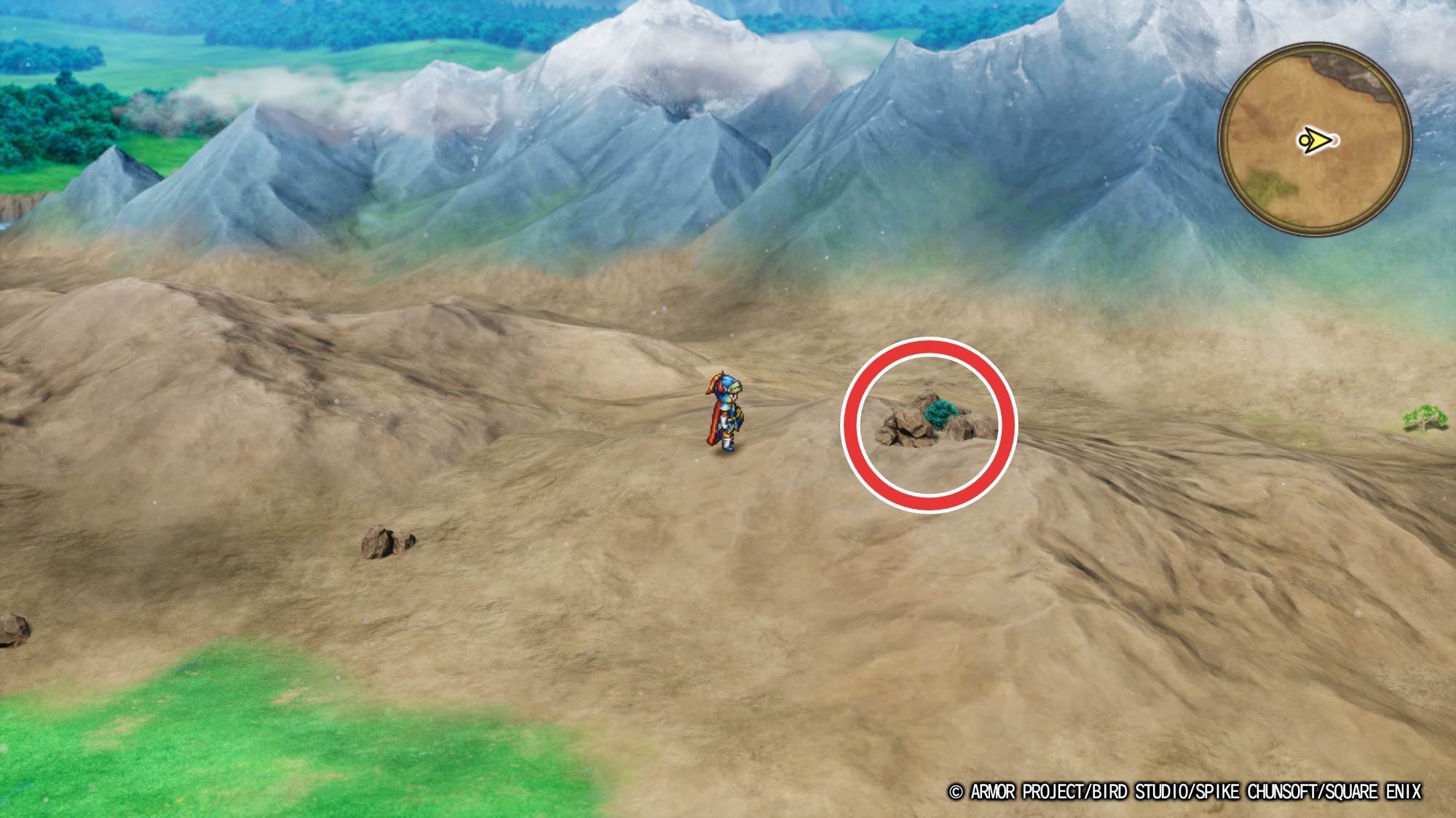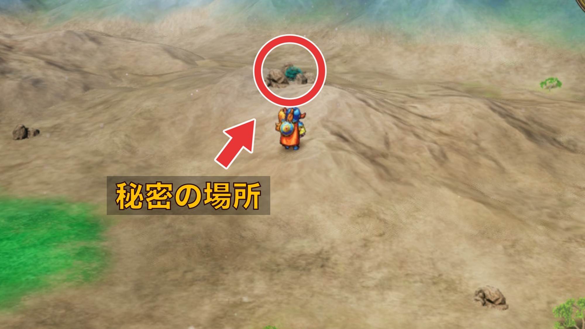 やまびこのぼうしの入手場所は、「街道の宿屋」から南東の山岳部にある秘密の場所です。宝箱やツボなどから入手するのではなく、秘密の場所左下の木の足元を調べると手に入ります。
