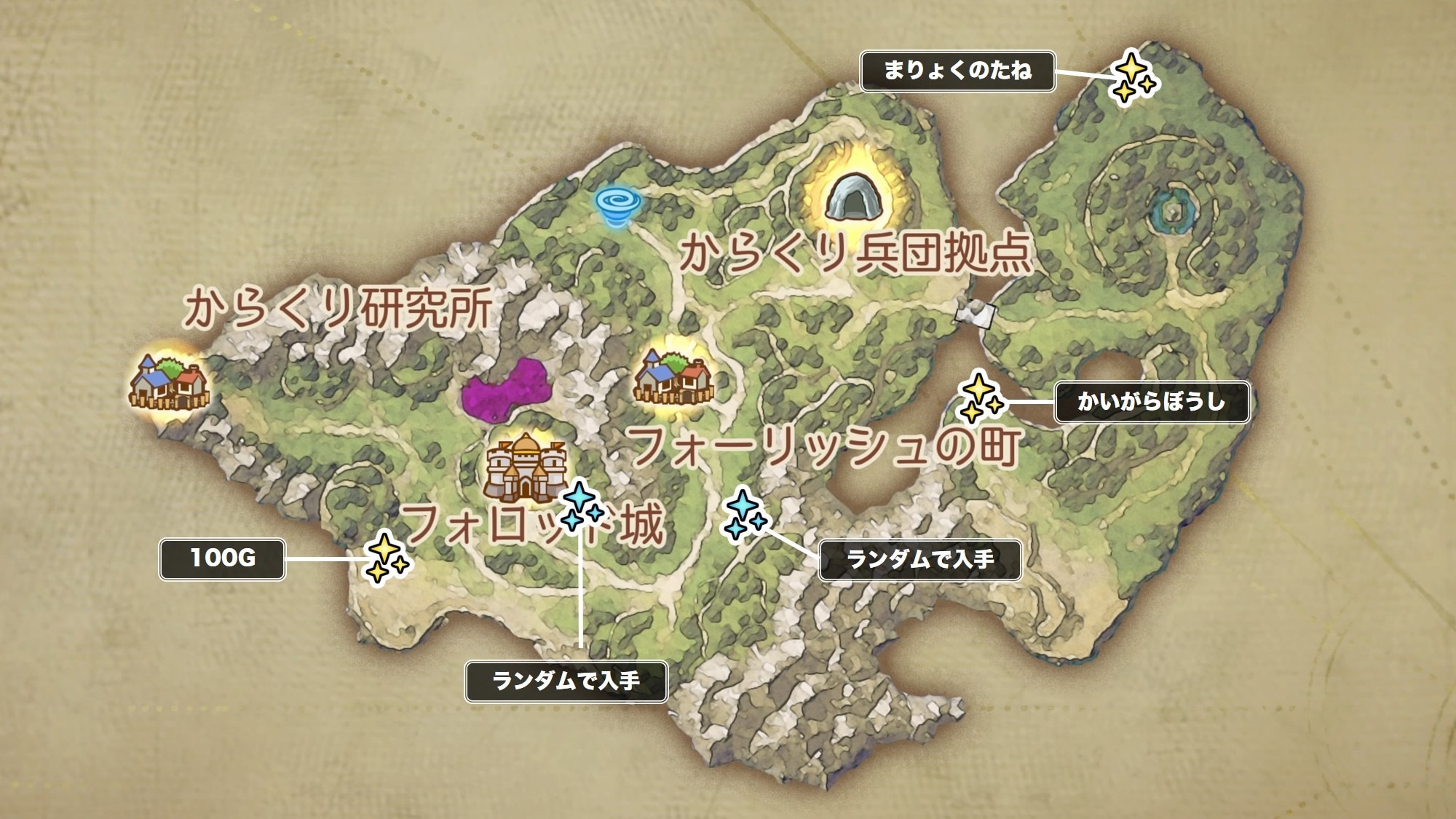 ドラクエ7リイマジンド(DQ7)のフォロッド周辺のマップをご紹介。ドラゴンクエスト7リメイクのフォロッド周辺で入手できるキラキラやモンスターを過去と現代合わせて記載しています。