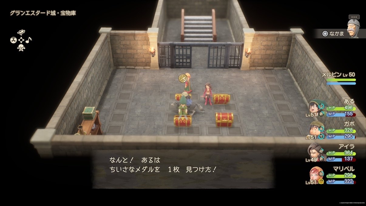 小さなメダルは、グランエスタード城1階東側にある交換所で景品と交換ができます。受付に話しかけると、小さなメダルの累計枚数と次の景品交換に必要な枚数も教えてくれます。
