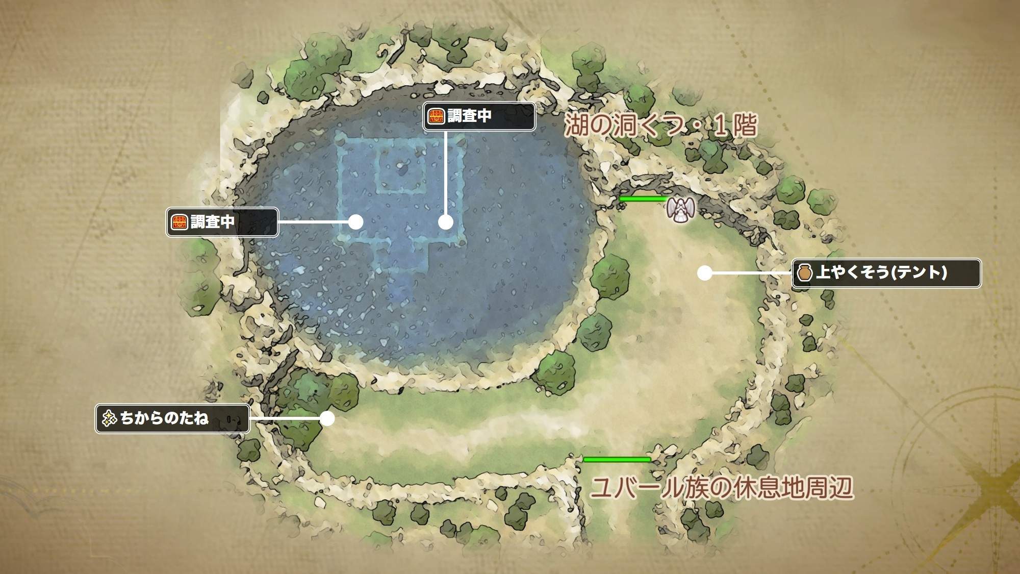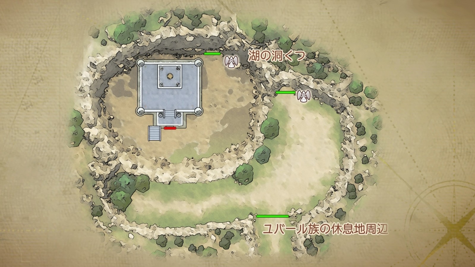 神の祭だんの湖は、ユバール族の休息地周辺の北西にあります。過去と現代共に場所は変わらないため、山間の道や海の見える丘から左上を目指しましょう。