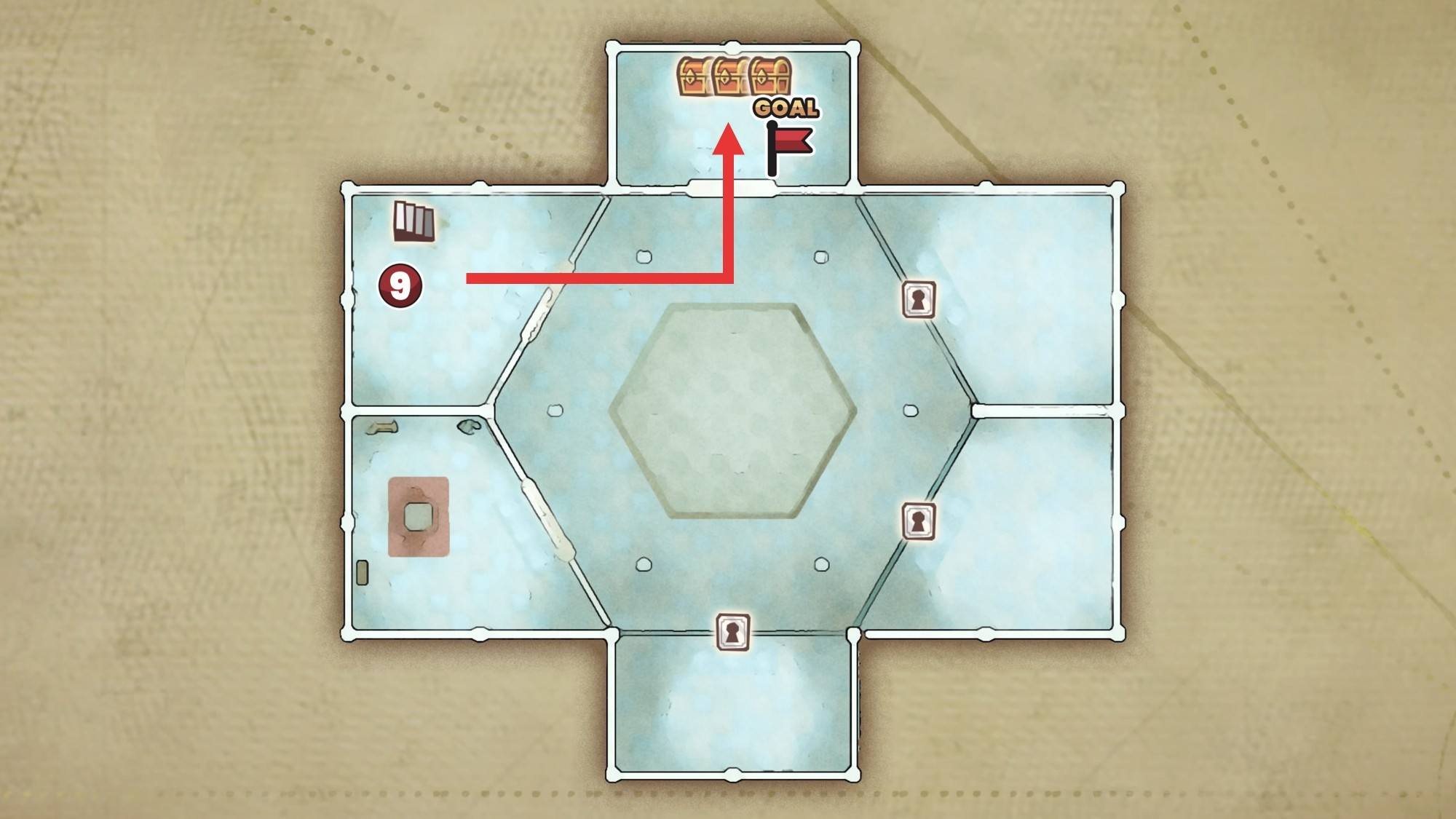 | 5 | 拡大する北側の部屋にある中央の宝箱を開けて最後の鍵を入手 |