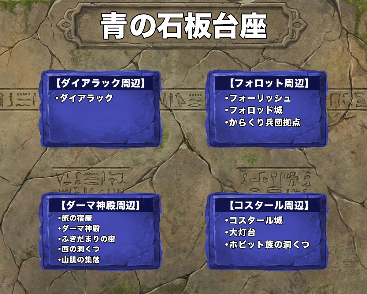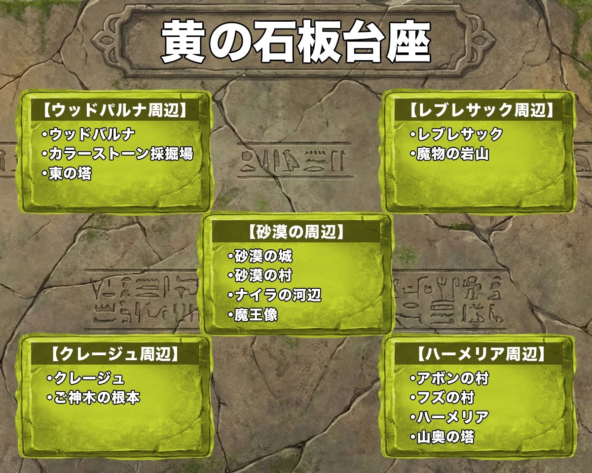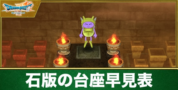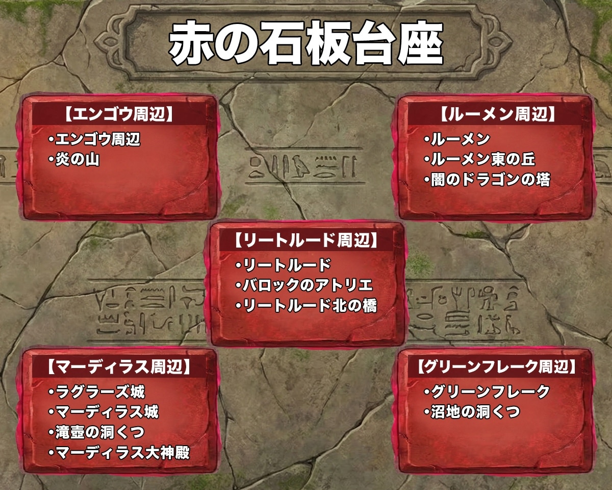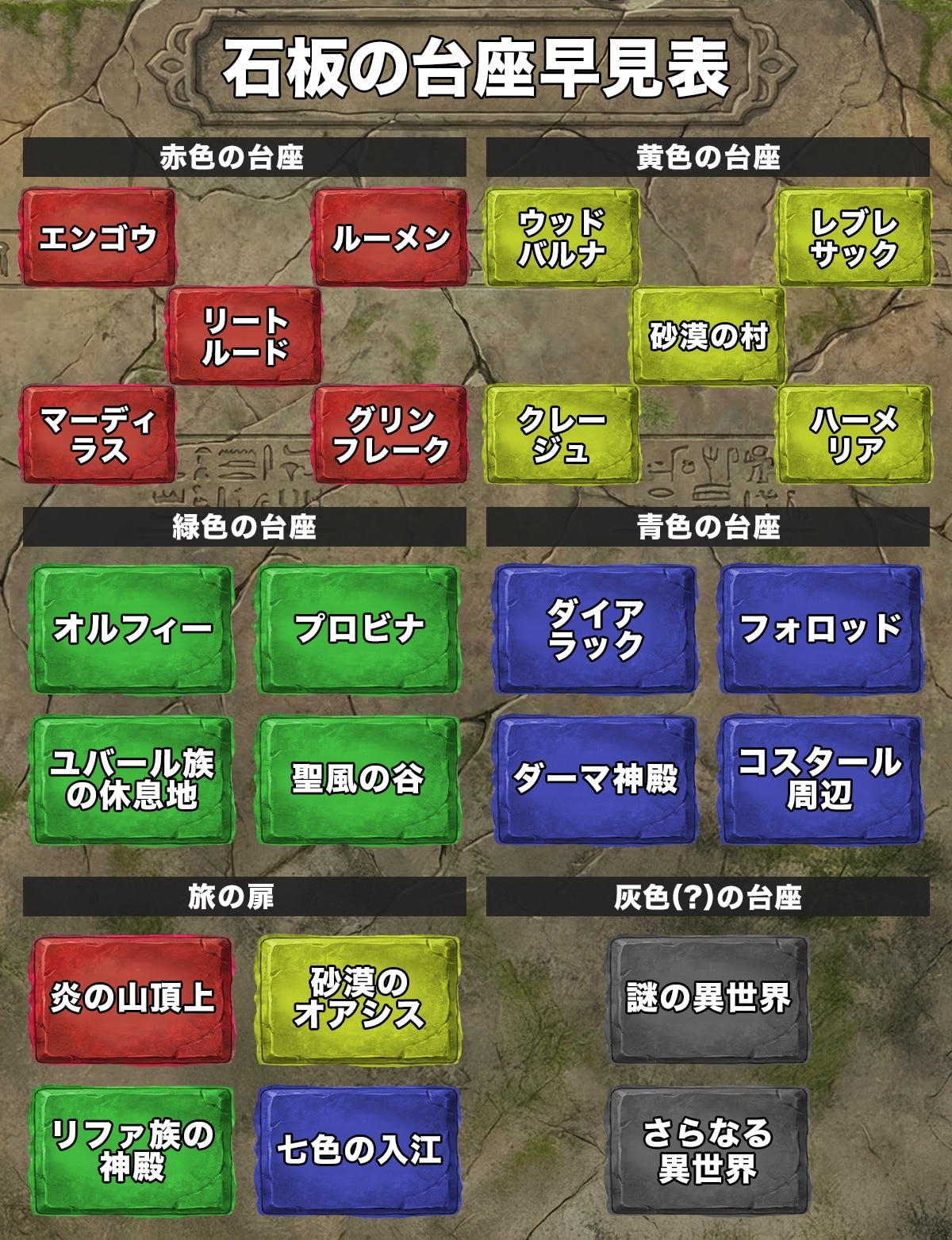 | 石版の台座早見表 | 石版の入手順と台座の場所 | ||||||||
