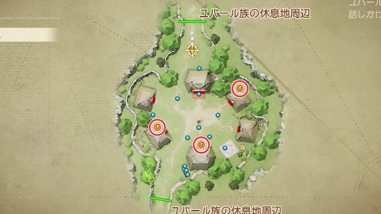 拡大するマップで表示されている村人3人と話しましょう。村人3人と話した後、北テント前にいる村人と話すとイベントが進みます。