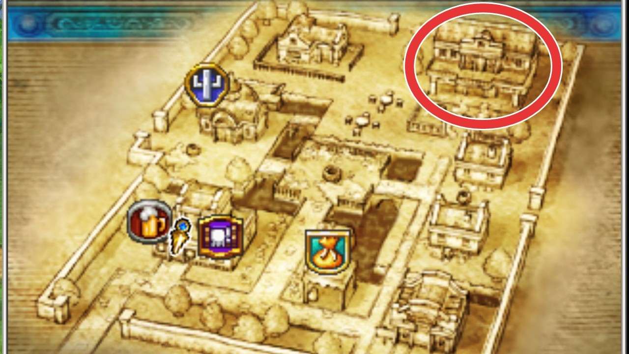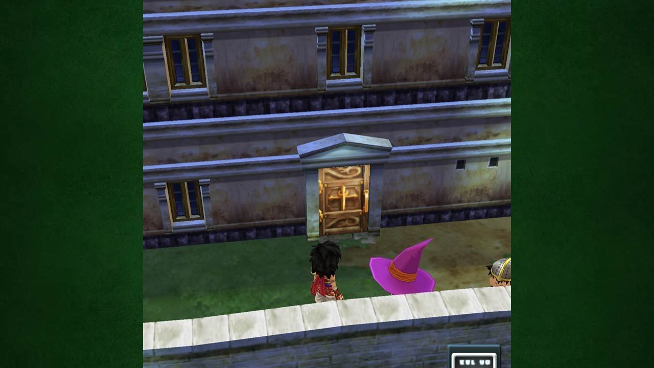 拡大する町の北東にある大きい建物に入りましょう。正面は鍵がかかっていて入れないので、北側にある裏口から入ります。カメラを回すと裏口を確認しやすいです。