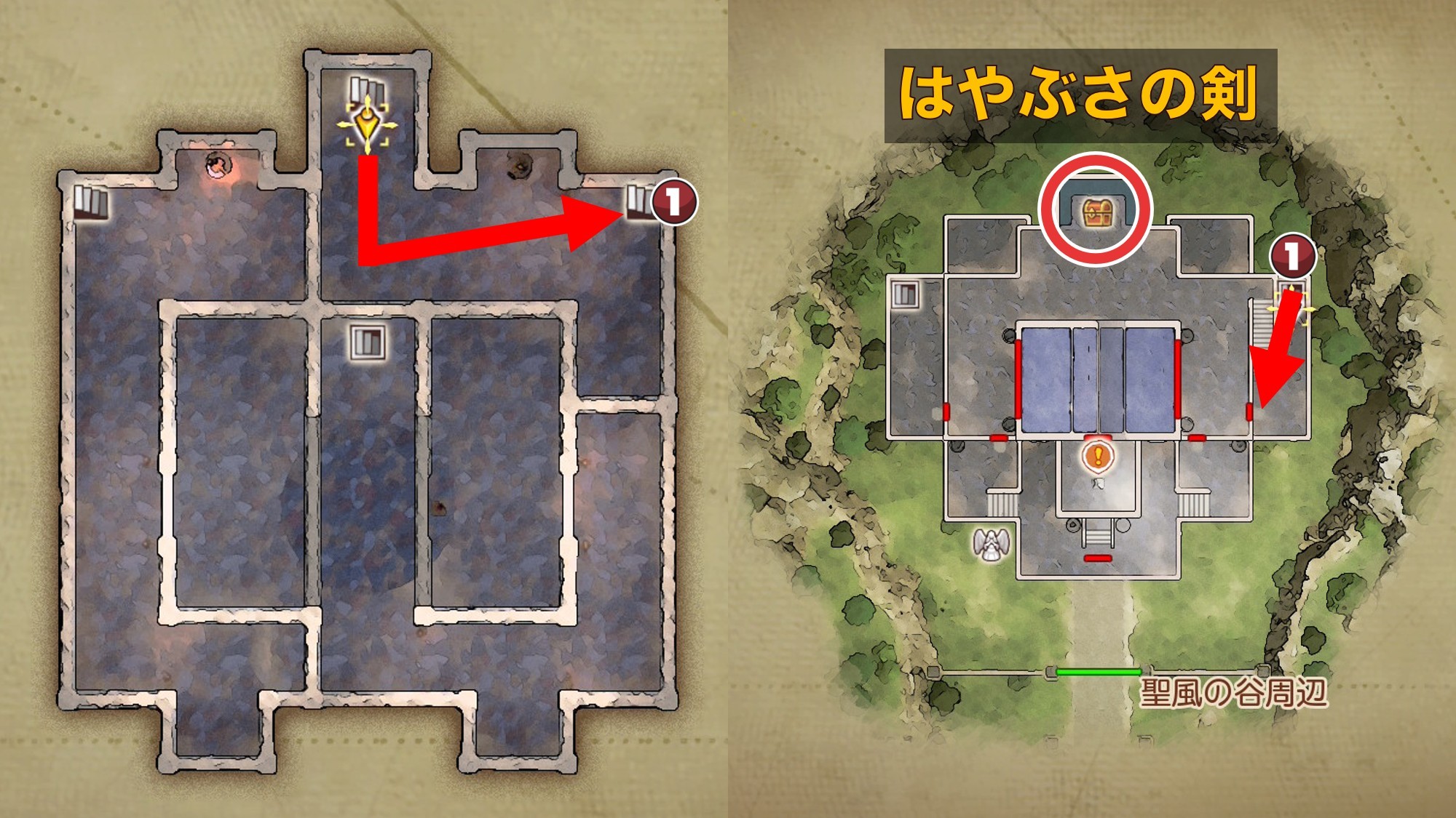 台座の奥に進んだら、3階を道なりに進んで東側から4階に入りましょう。また、3階から外に出た際に、宝箱から2回攻撃できる「はやぶさの剣」を入手できるため、寄り道して回収するのがおすすめです。