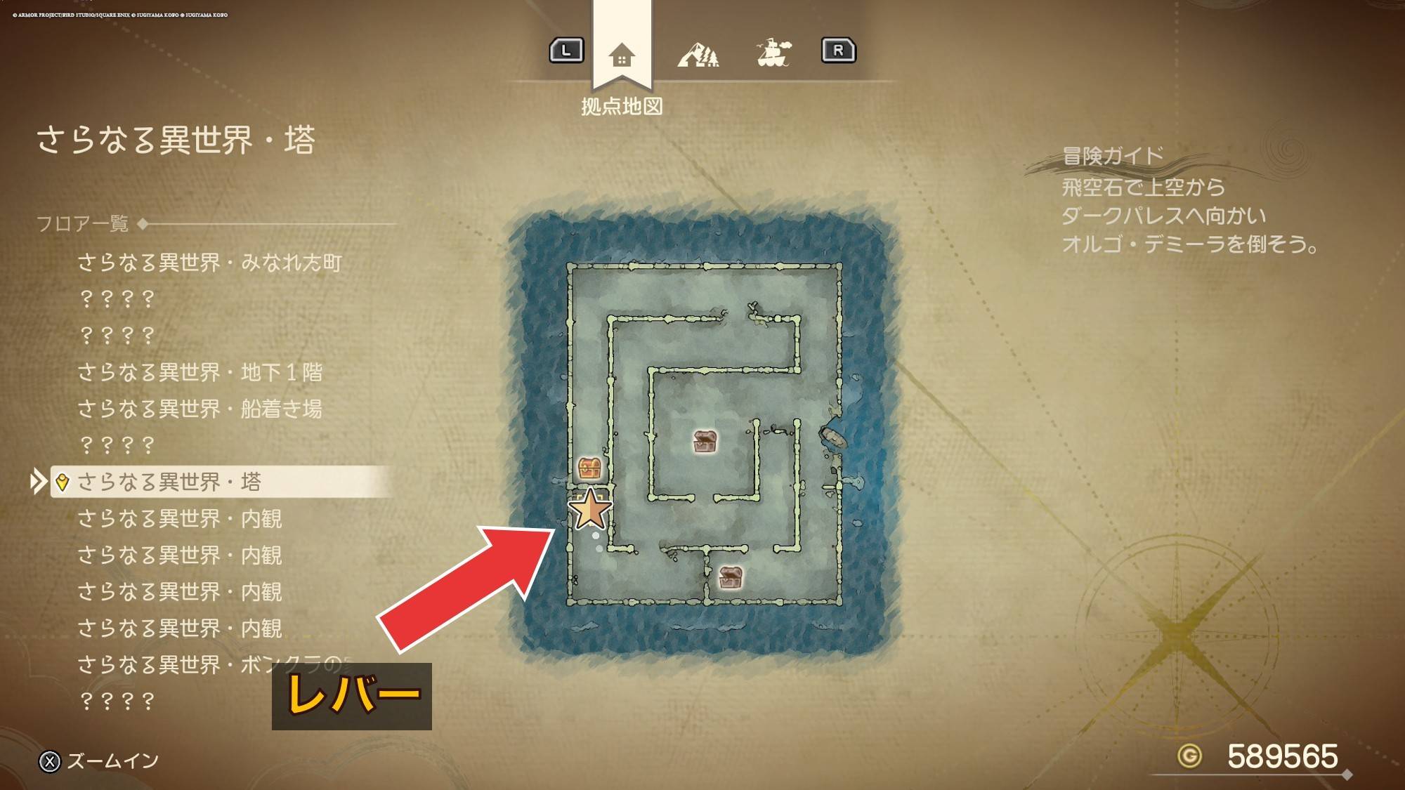 拡大する最初のマップに戻ったら、北の船着き場へ進みましょう。小舟に乗って進んだ先のフロアでレバーを引けます。レバーを引いたら来た道を戻りましょう。