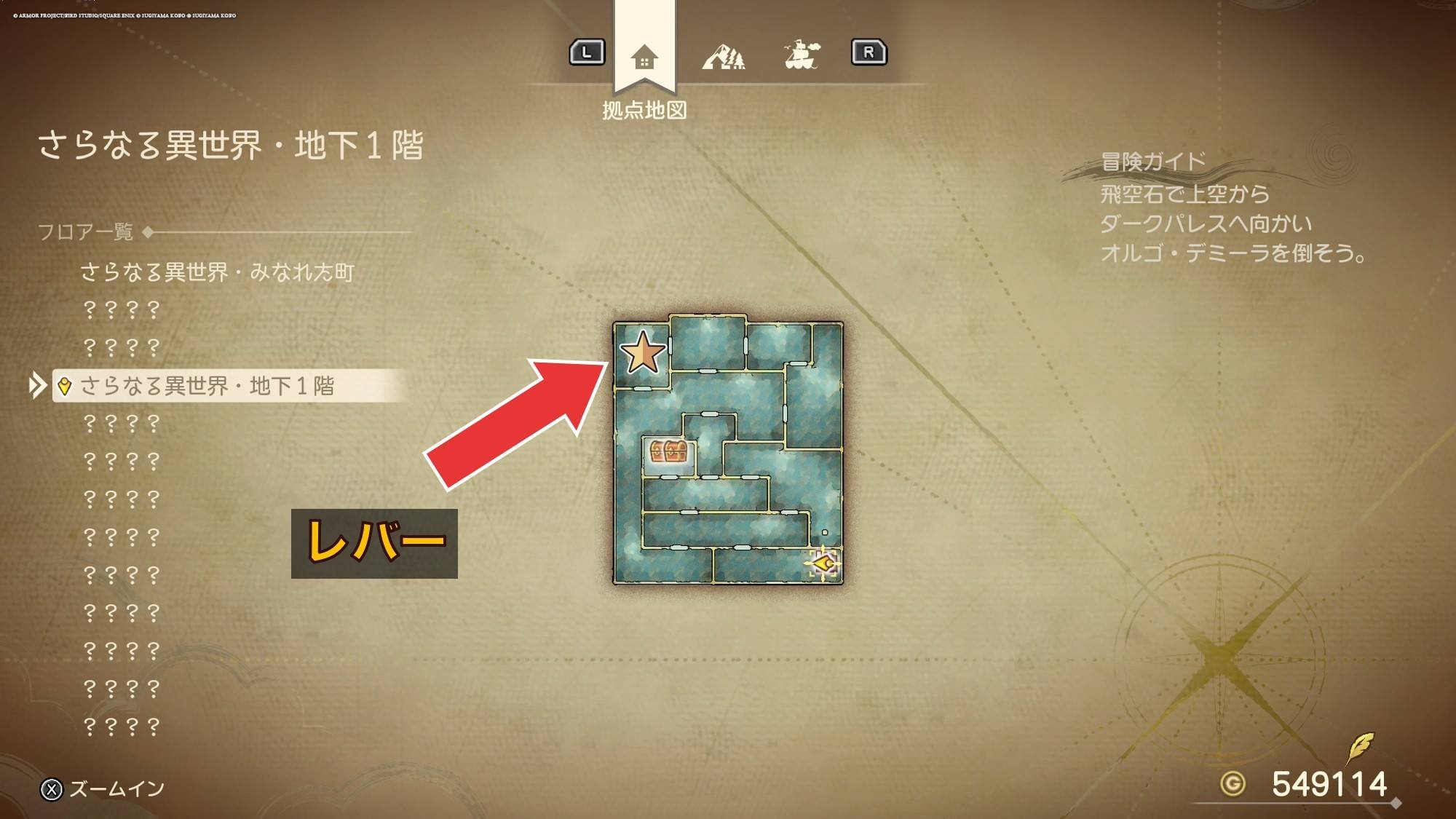 道なりに進んで動く足場のフロアに着いたら、マップ北東の穴から落ちましょう。北東の穴に落ちると、レバーの前に着地できます。レバーを引いたら最初のマップに戻りましょう。