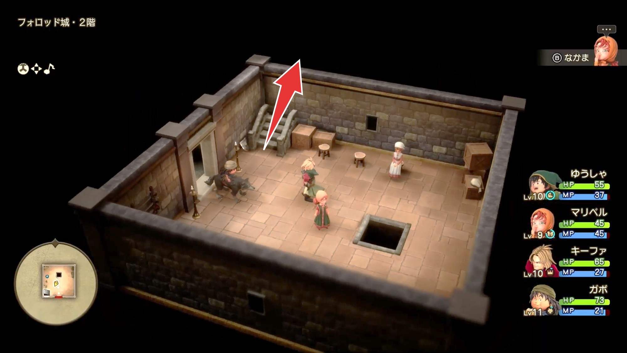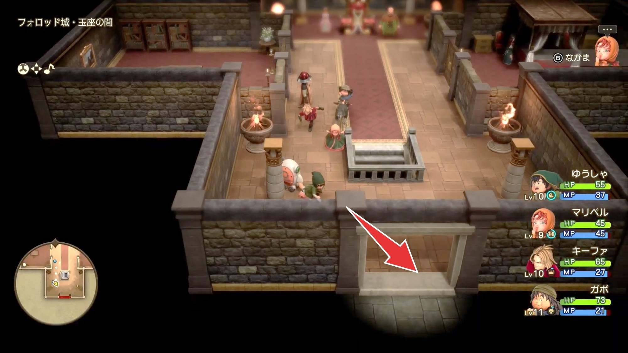 拡大する建物の中に入ったら階段を上ると到着王様に話しかけたら、玉座の間から外に出て、見張りをしている兵士の所へ向かいましょう。外に出たら、カメラを180度回転すると目的地が分かりやすいです。