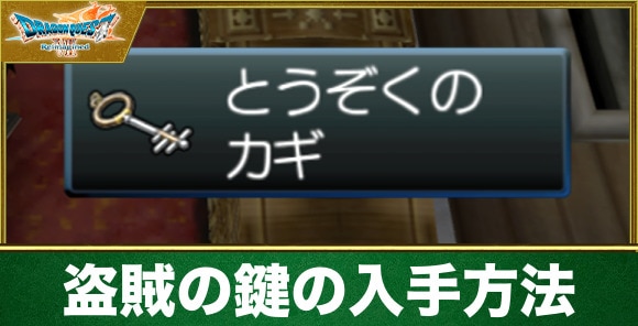 盗賊の鍵は、ダーマ神殿周辺エリア(過去)の「ふきだまりの町」の貸し部屋の宝箱から入手できます。最初に訪れた時は、宝箱の中身を回収できないので、ダーマ神殿(過去)のストーリーを進めて、アントリアを倒した後に再度訪れて入手しましょう。