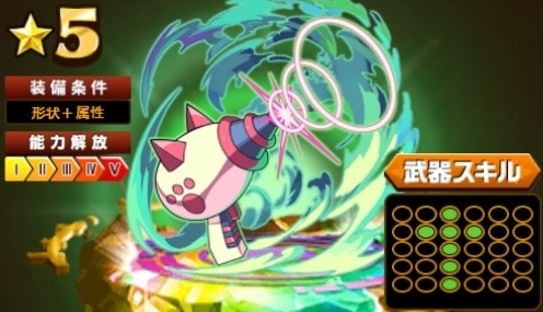 スキル | ピース操作終了後、盤面の水ピースを木ピースに5個変化させ、再コンボする【チャージ済みでスタートする】 | ||