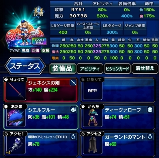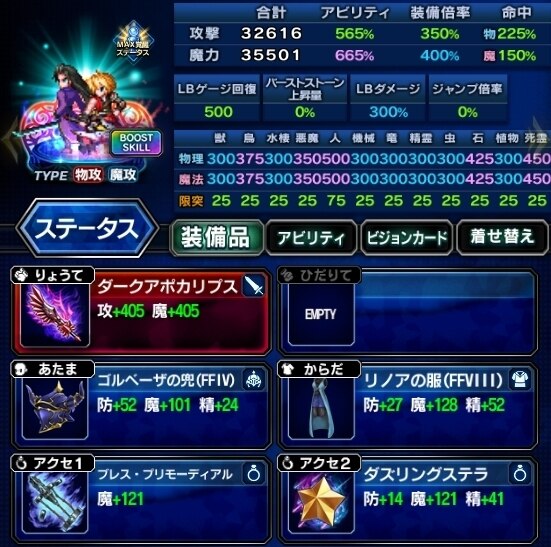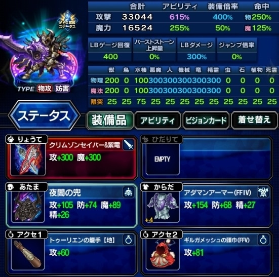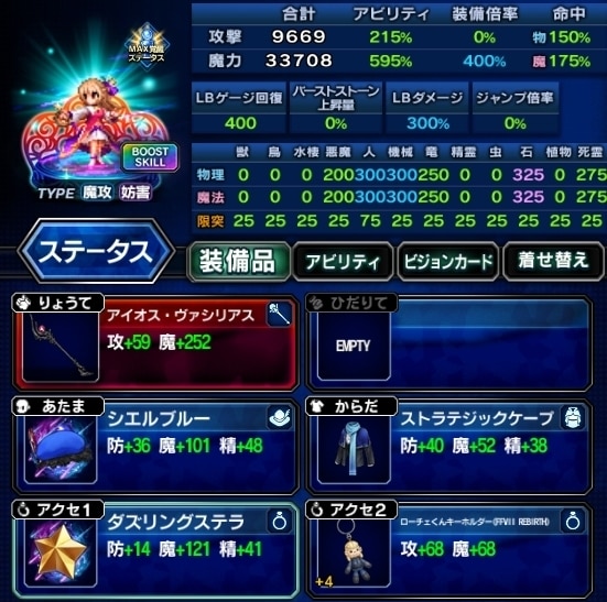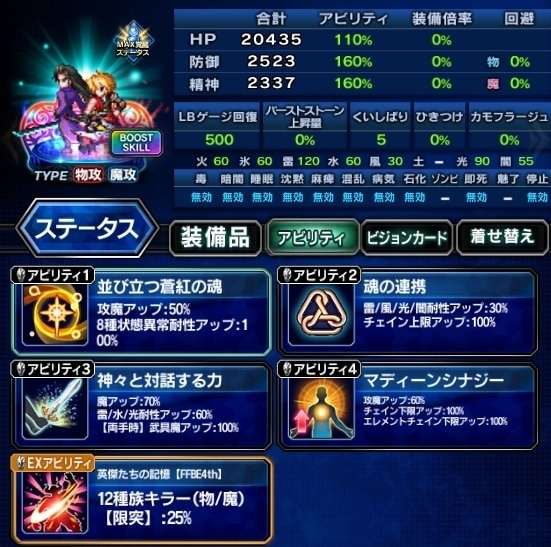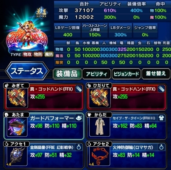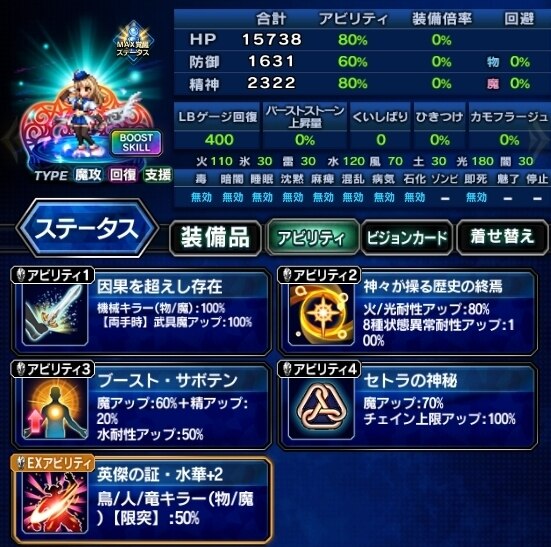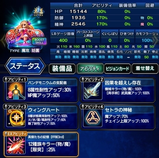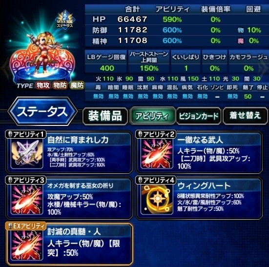 ▶装備編成例を見る ▶アビリティ編成例を見る VC:常に胸を張れ ・EX+3 ・状態異常耐性 ・攻撃、LB、キラーを高める ・人キラー限界突破75%、機械/竜25% |