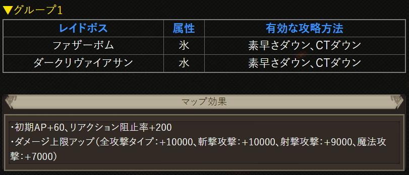 グループ1では「斬撃」「射撃」「魔法」の3タイプに対してダメージ上限が付与されます。全ての攻撃タイプ+10,000に加えて「斬撃タイプは+10,000」「射撃は+9,000」「魔法は+7,000」が追加されます。