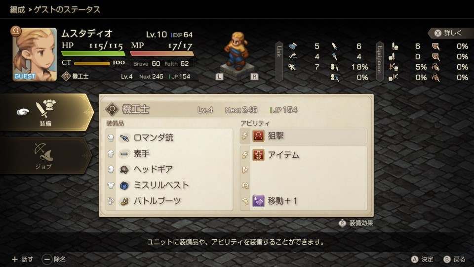 城塞都市ザランダクリア後は、機工士ムスタディオが加入します。ムスタディオはドンアクやドンムブなど敵の動きを制限するアビリティを習得する他、銃で遠距離攻撃ができるユニットです。