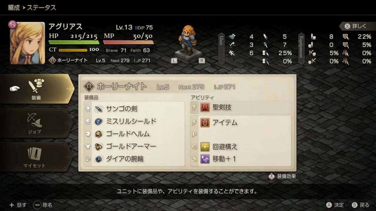バリアスの谷クリア後は、アグリアスが隊に正式加入します。今まではゲスト扱いでしたが、正式加入したことで自分で操作可能になるため、アビリティや装備などを整えましょう。