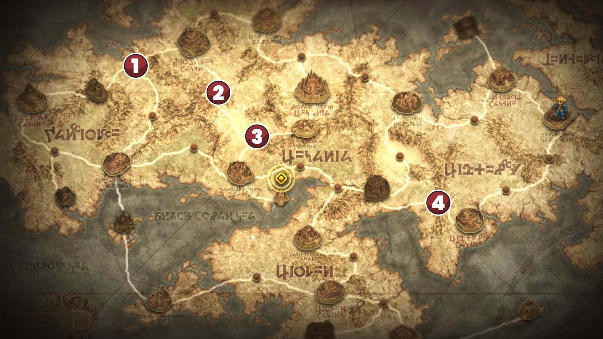 デジェネレーターがあるマップ ① フォボハム平原 ② ベルベニア活火山 ③ ゼクラス砂漠 ④ ドルボダル湿原