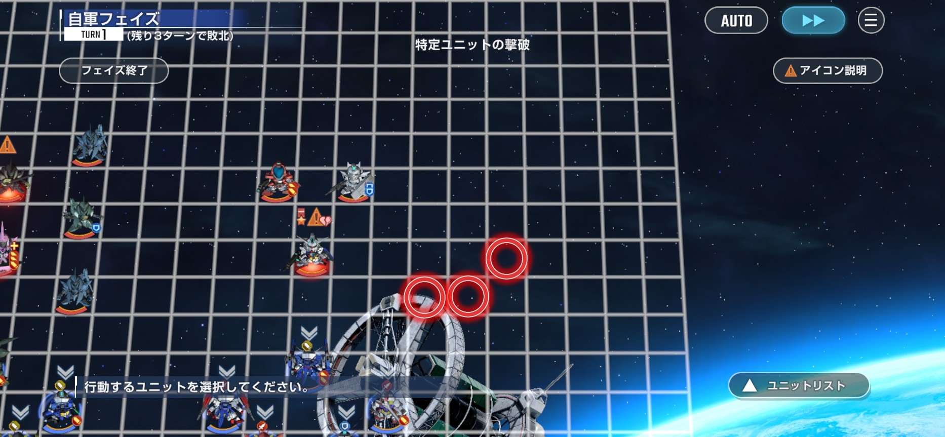 また、3ターン目敵軍フェイズには撃破する必要のない雑魚敵から優先して行動します。自軍フェイズでAGE-2とゼイドラどちらも撃破し、ステージクリアを目指しましょう。