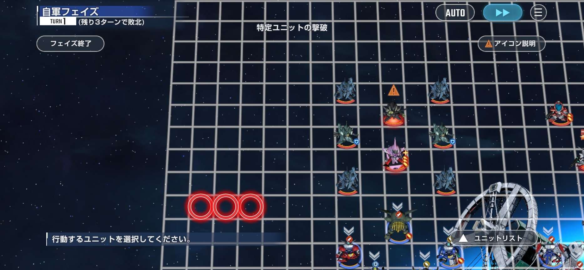 増援出現のタイミングで味方ユニットの配置を整えなければ、クリアは難しいです。1ターン目は雑魚敵と支援ユニット処理、2ターン目は増援に向けた位置調整、3ターン目は目標撃破に充てましょう。